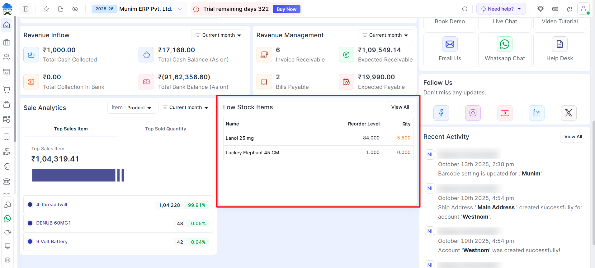- On the Dashboard, a quick report of low stock items is available, displaying reorder levels and the actual quantity on hand at last on the page.