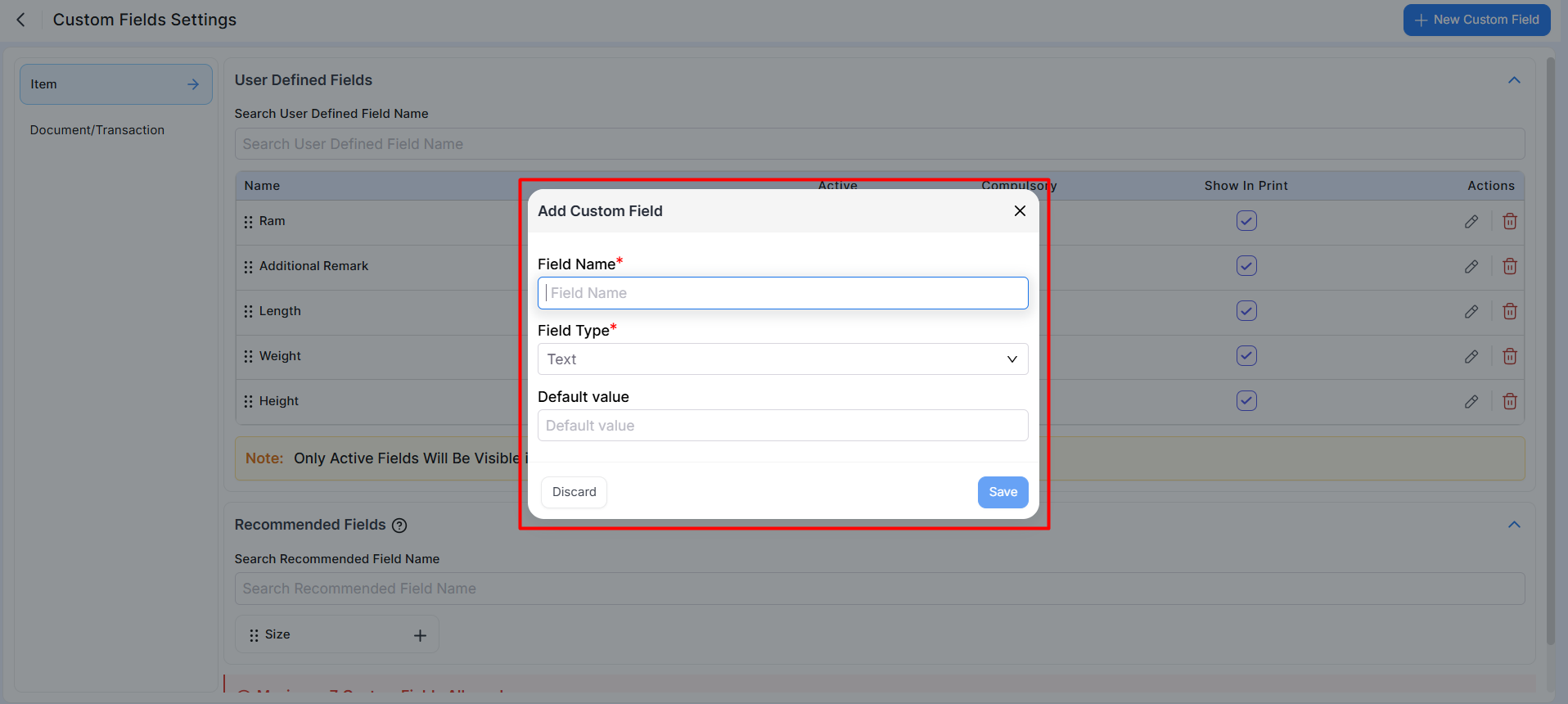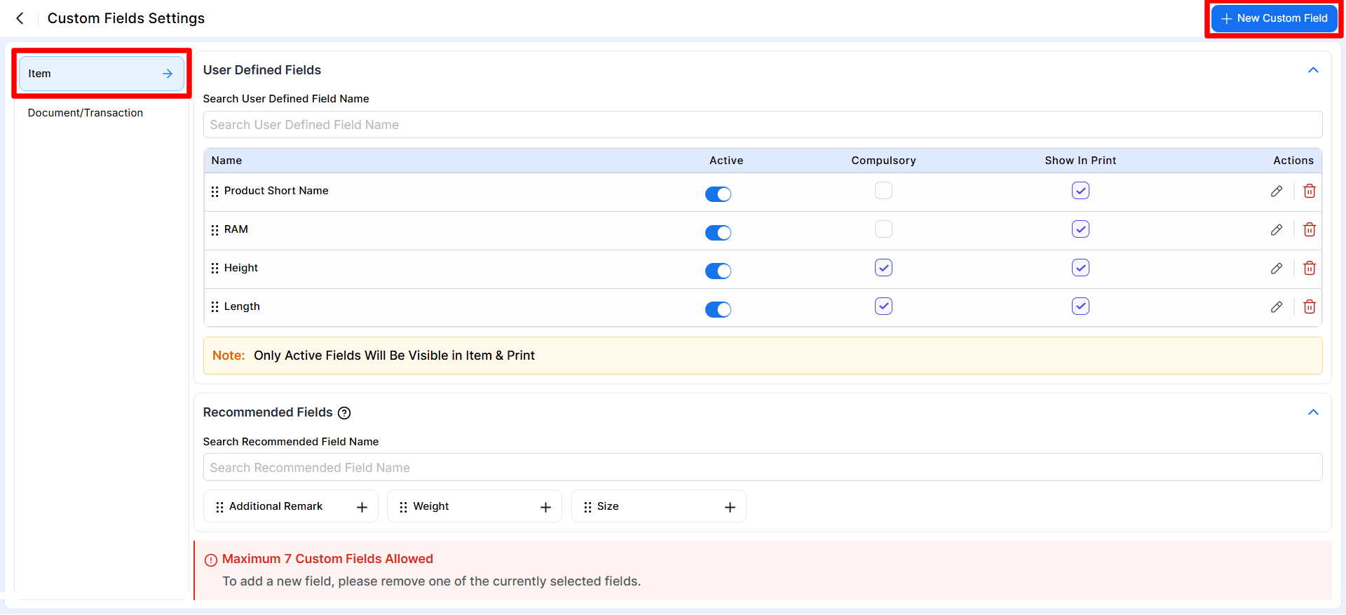 Note: Only active custom fields will be visible in Item Master and print layouts.