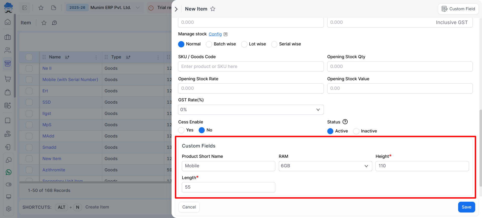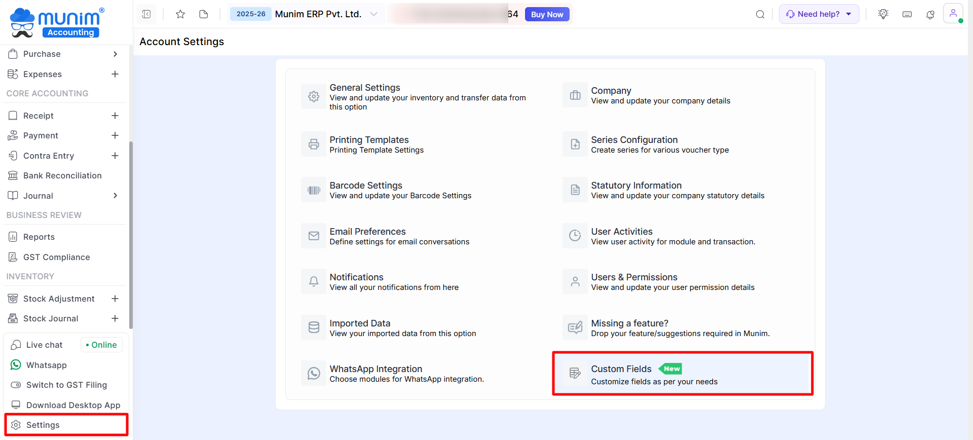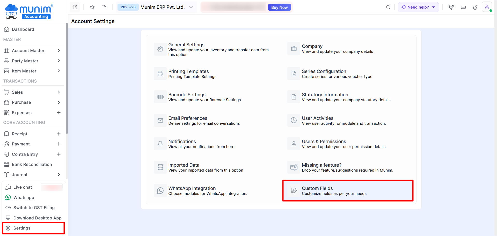 The Custom Fields feature in Munim allows you to add and manage additional fields as per your business requirements.