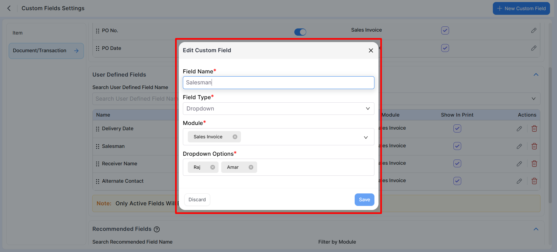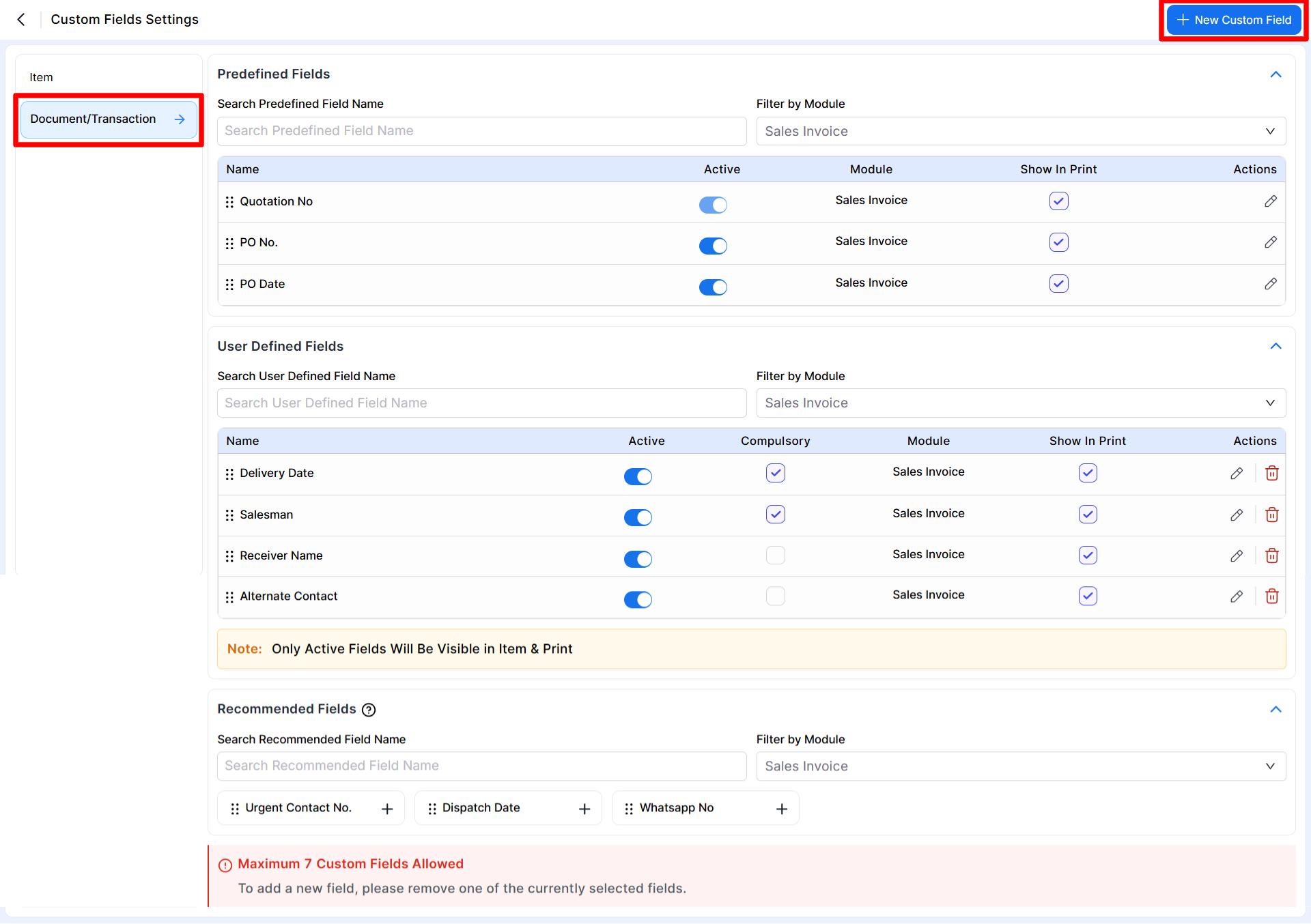 • Only active fields will be visible during transaction entry and on printed documents.