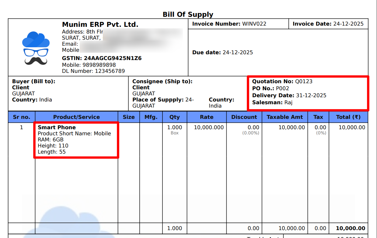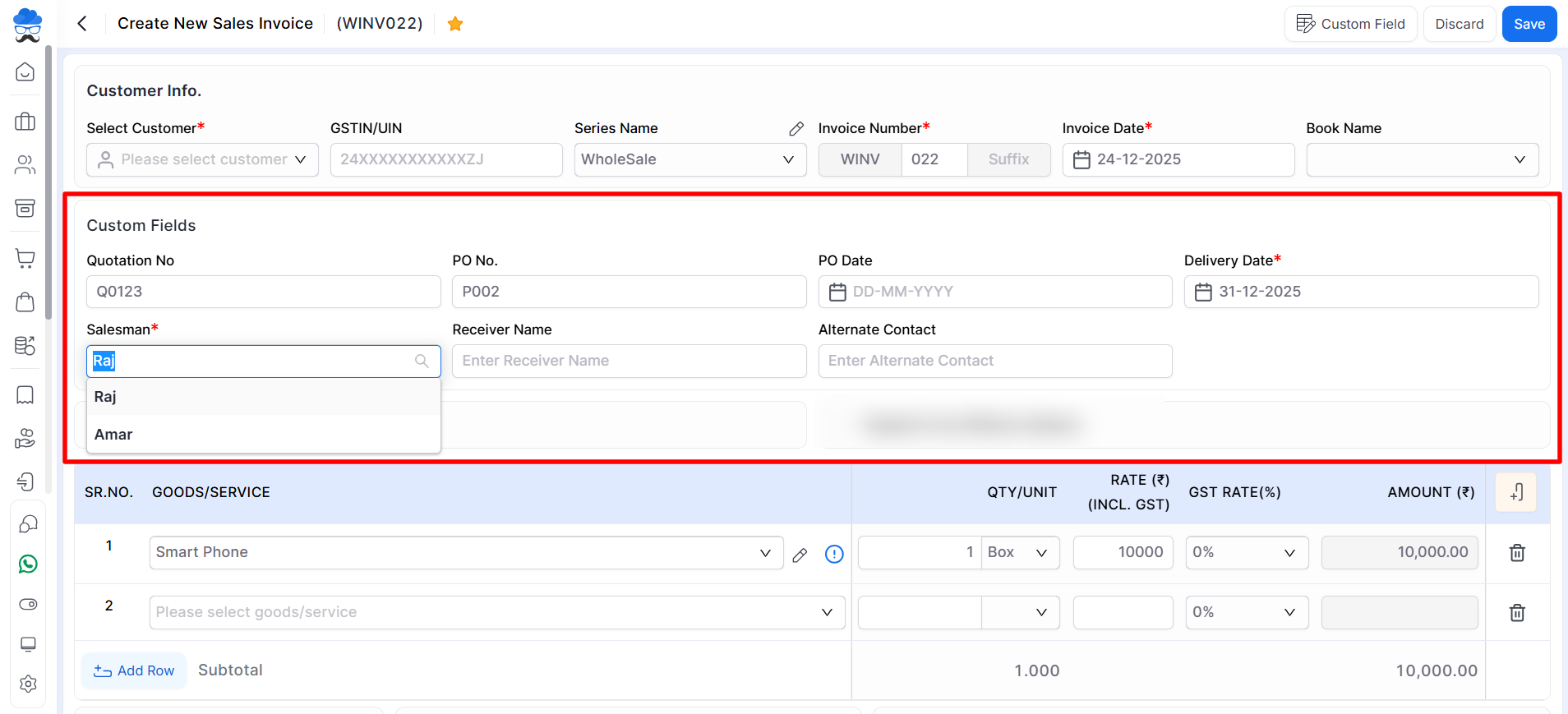 • Following the addition and configuration of custom fields, users can add them while creating sales invoices.