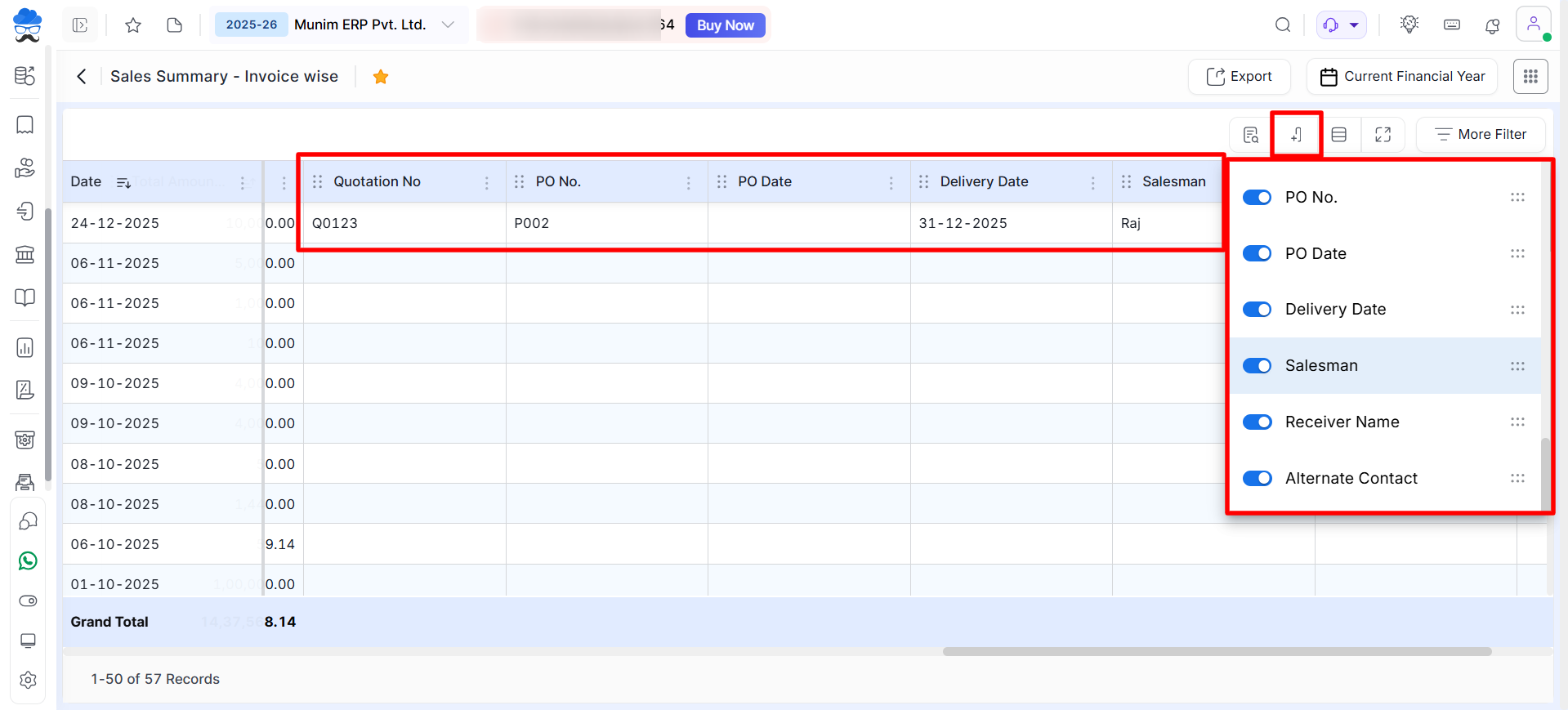 • Within the reports, users can enable or disable custom field columns to display them as required in each report.