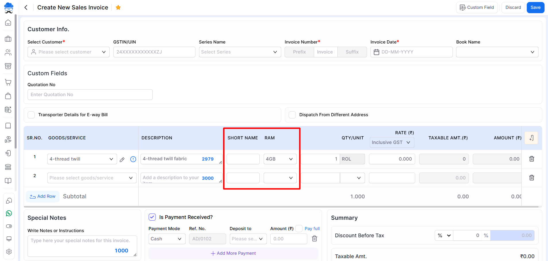 - Following the addition and configuration of custom fields, users can add them while creating sales invoices.