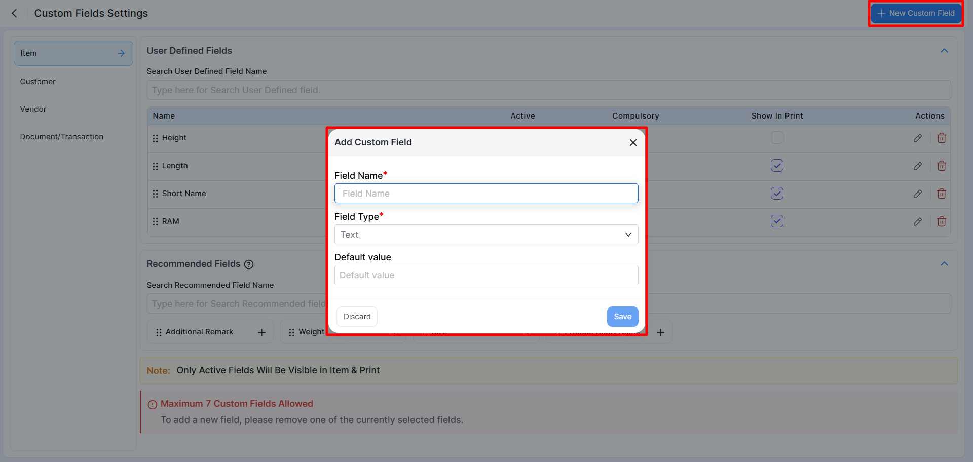 - A maximum of 7 custom fields is allowed per module.