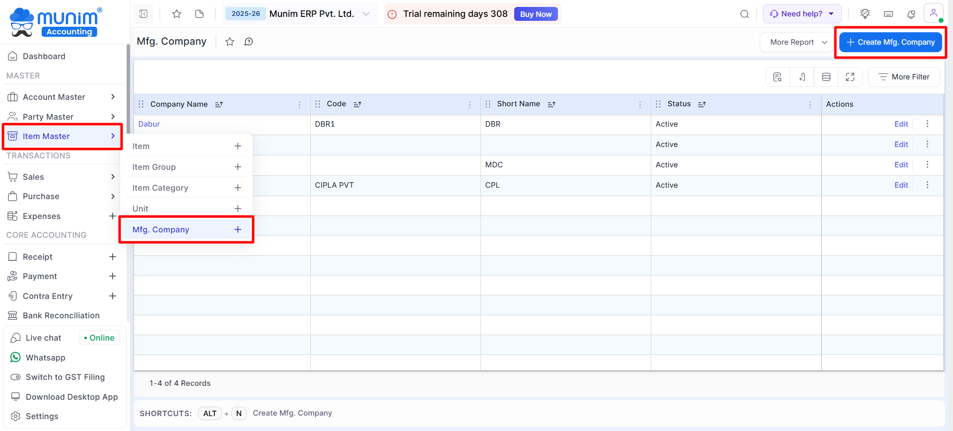To enable Mfg. Company master, first activates the Mfg. Company from General setting module. Click this link to learn more.