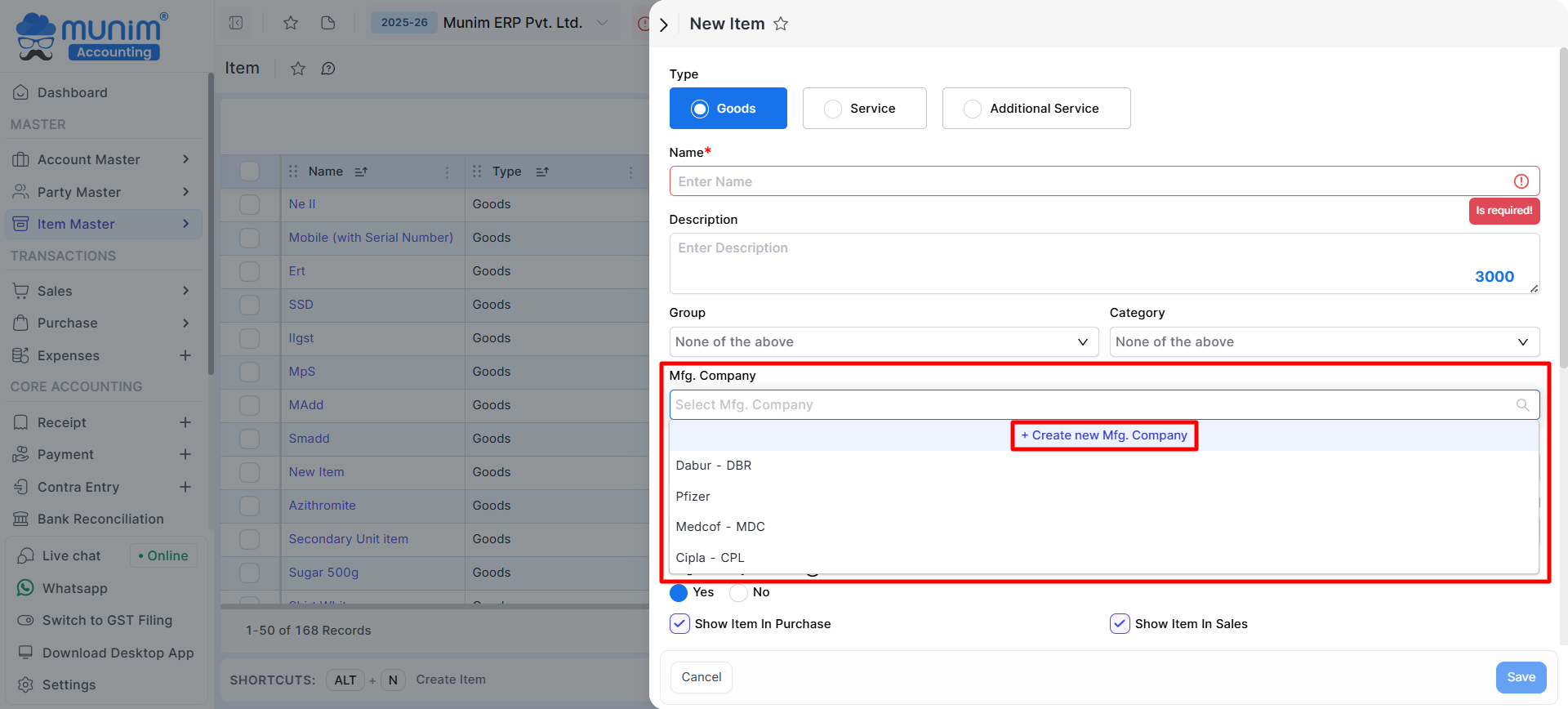 - You can select any of the created Mfg. company in the item while creating or editing any Item.