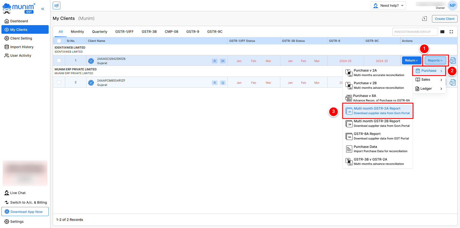 - On the My Clients page, click the Reports button, then click on the Purchase section and select “Multi month GSTR-2A Report”.