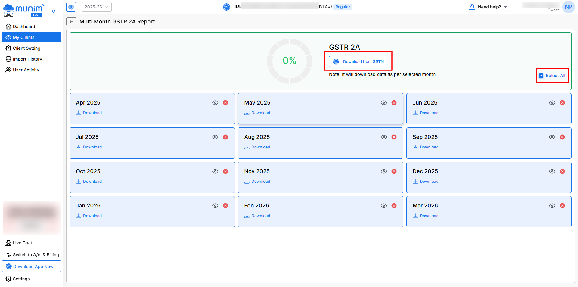 - After successfully downloading your data, you can view it month-wise by clicking on the View icon (👁) and use it for Purchase vs. GSTR-2A reconciliation.