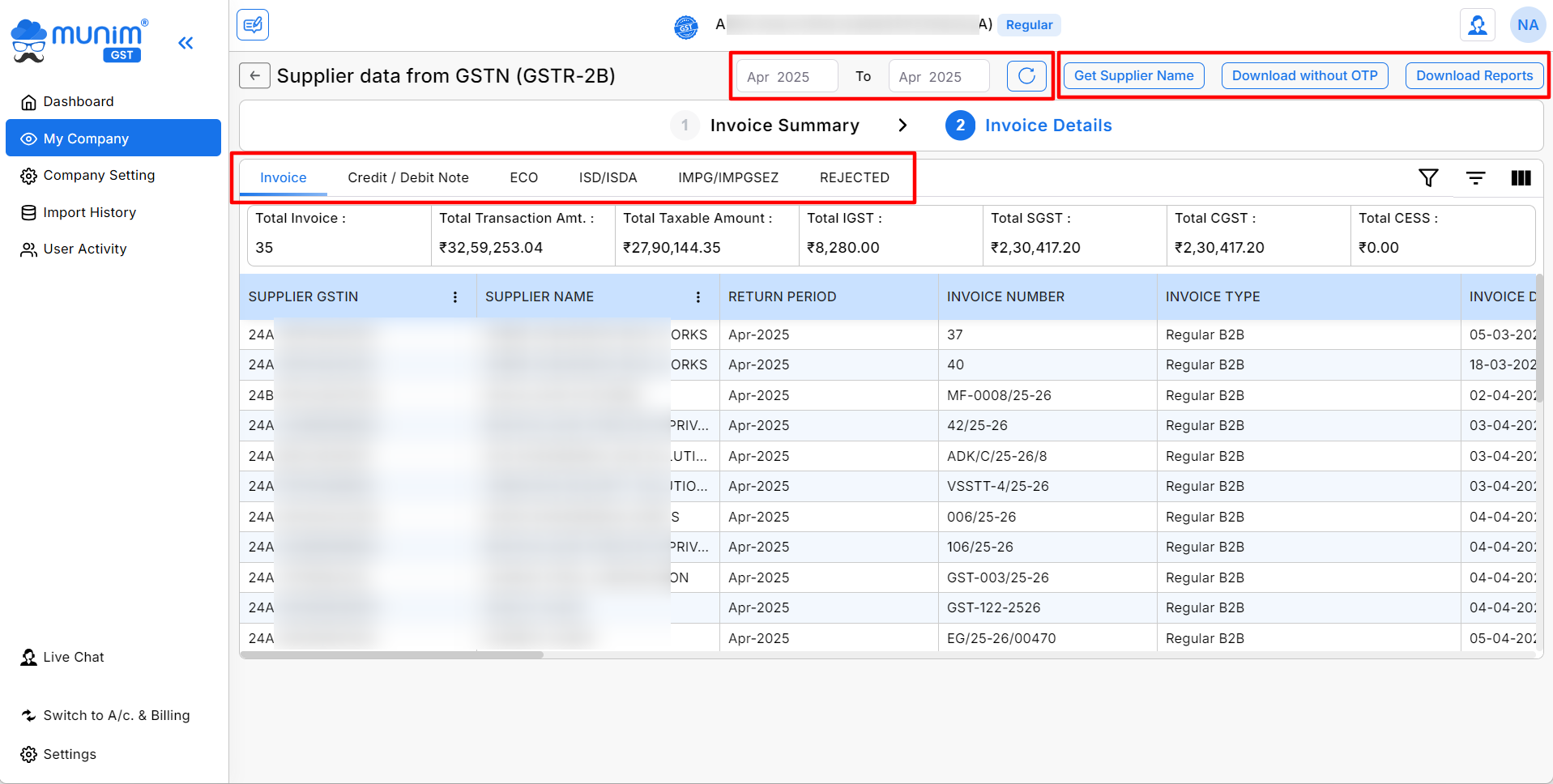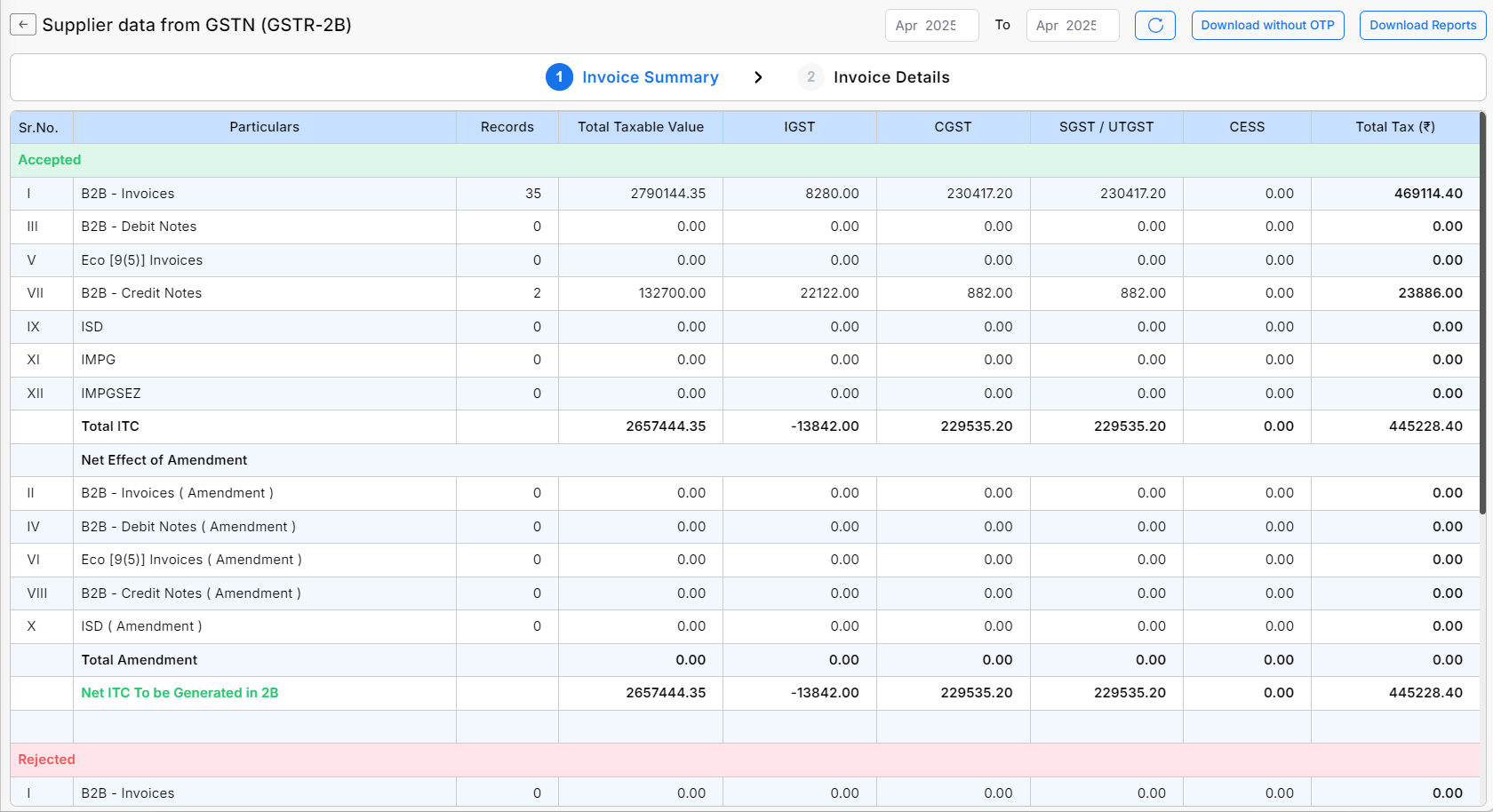 - Here on this page, you will find the data of the GSTR-2A in two sections, Invoice Summary and Invoice Details