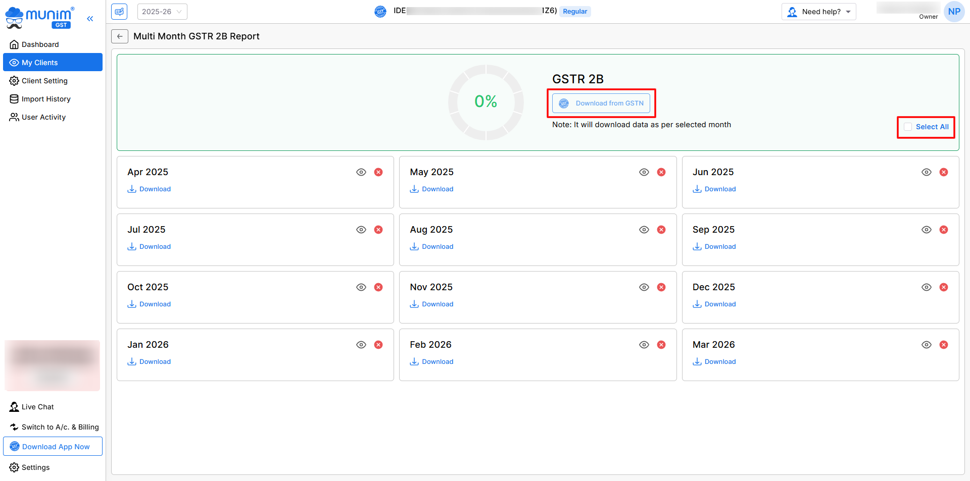 - After successfully downloading your data, you can view it month-wise by clicking on the View icon (👁) and use it for Purchase vs. GSTR-2B reconciliation.