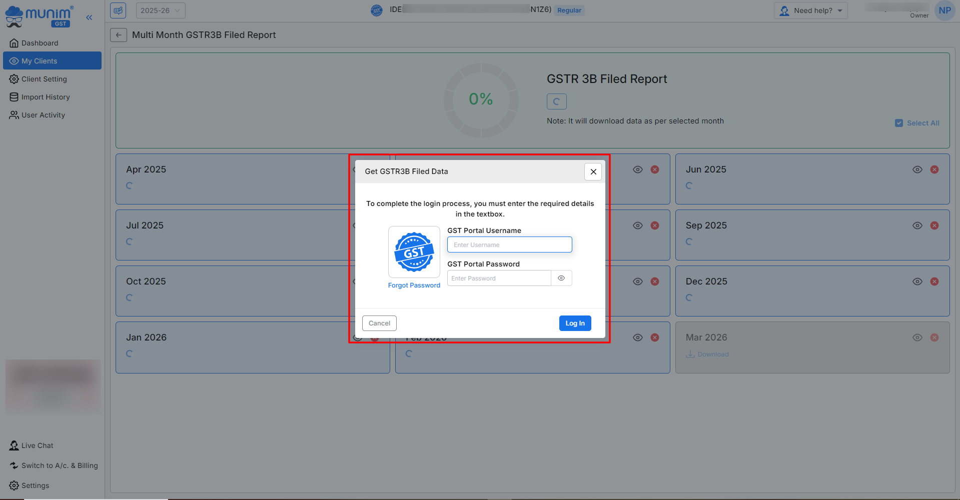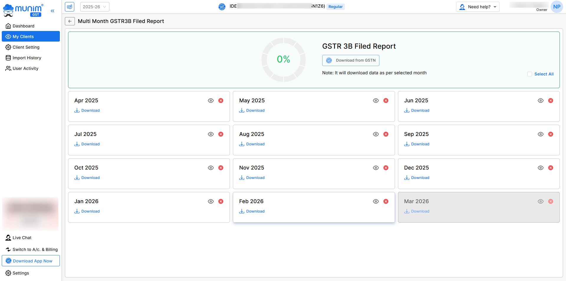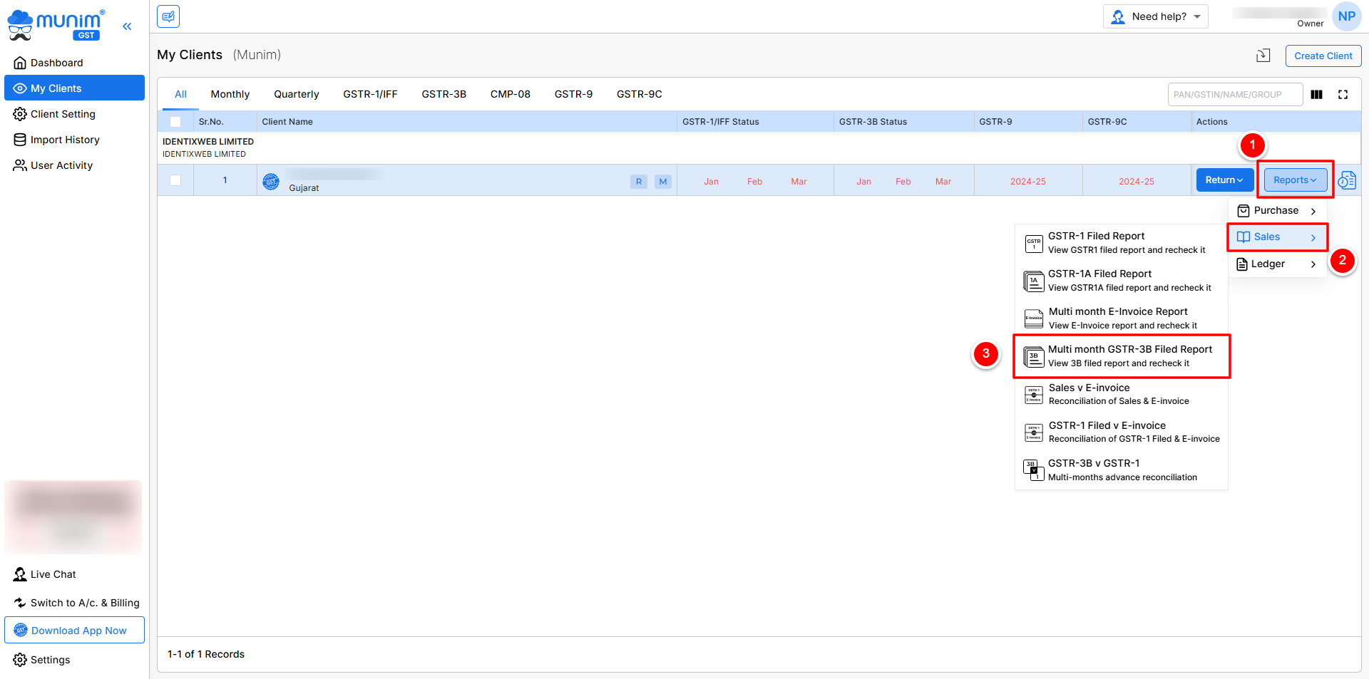 • Select “Multi month GSTR-3B Report” from the Reports option on the My Clients page.