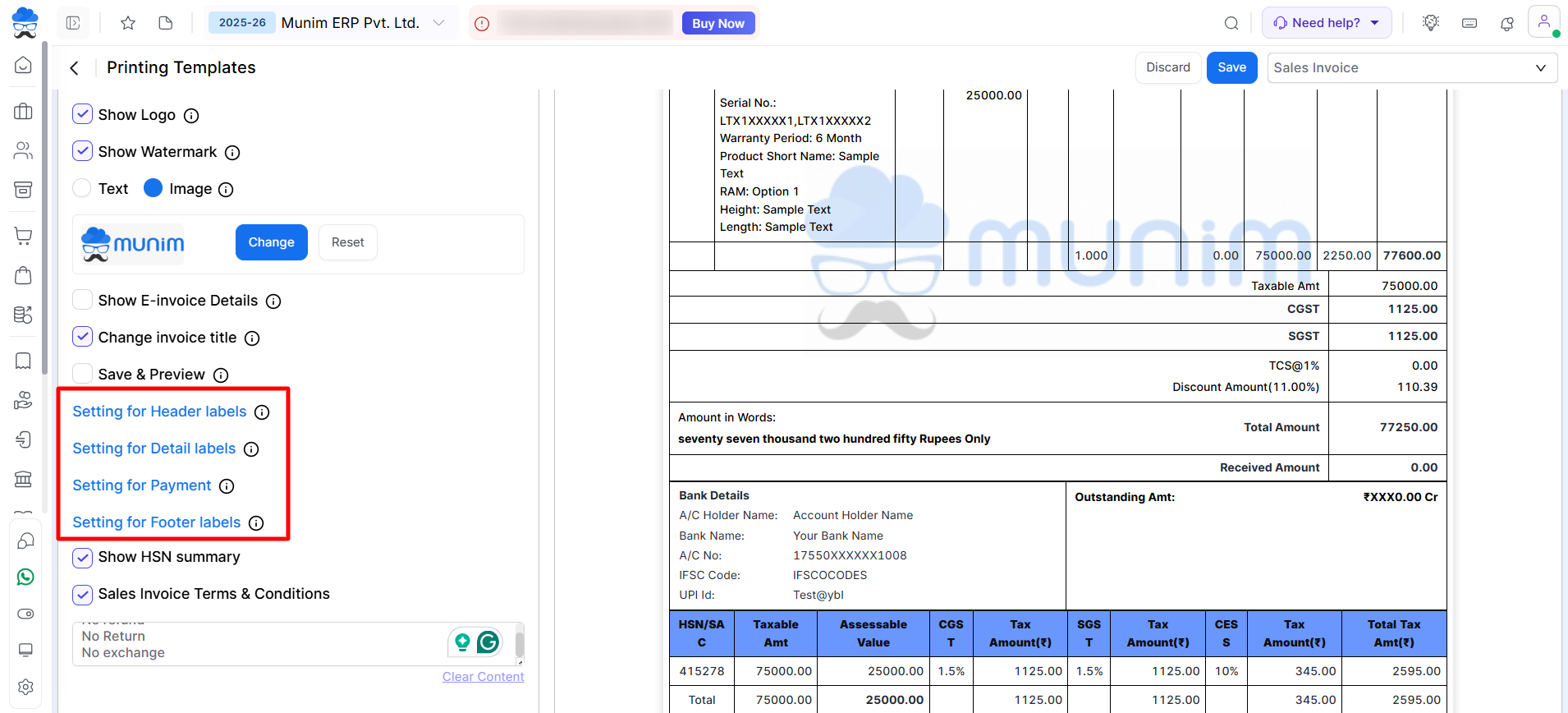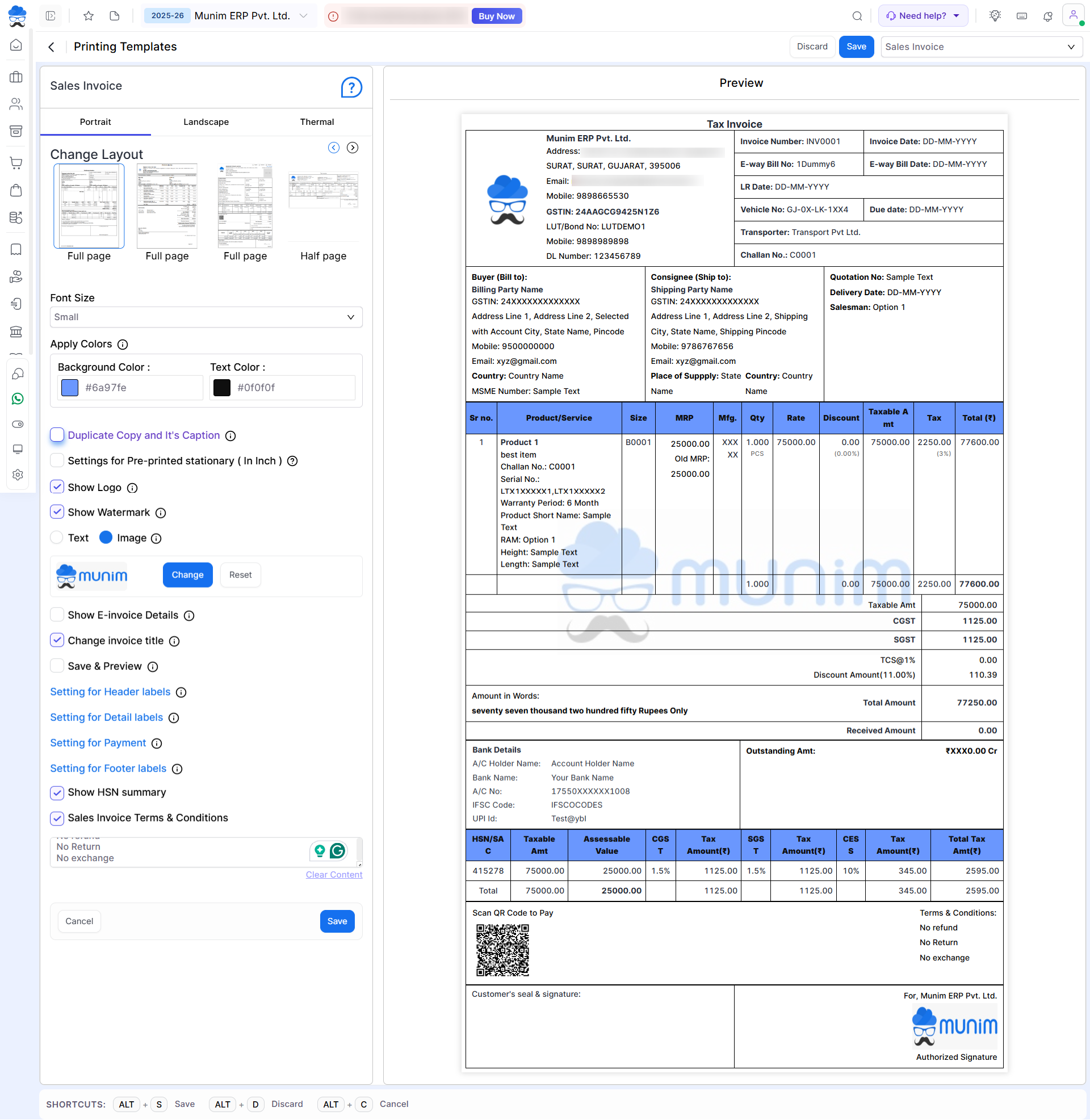 - This setting facilitates print customization to display payment-related details, such as bank information and UPI ID/QR codes.