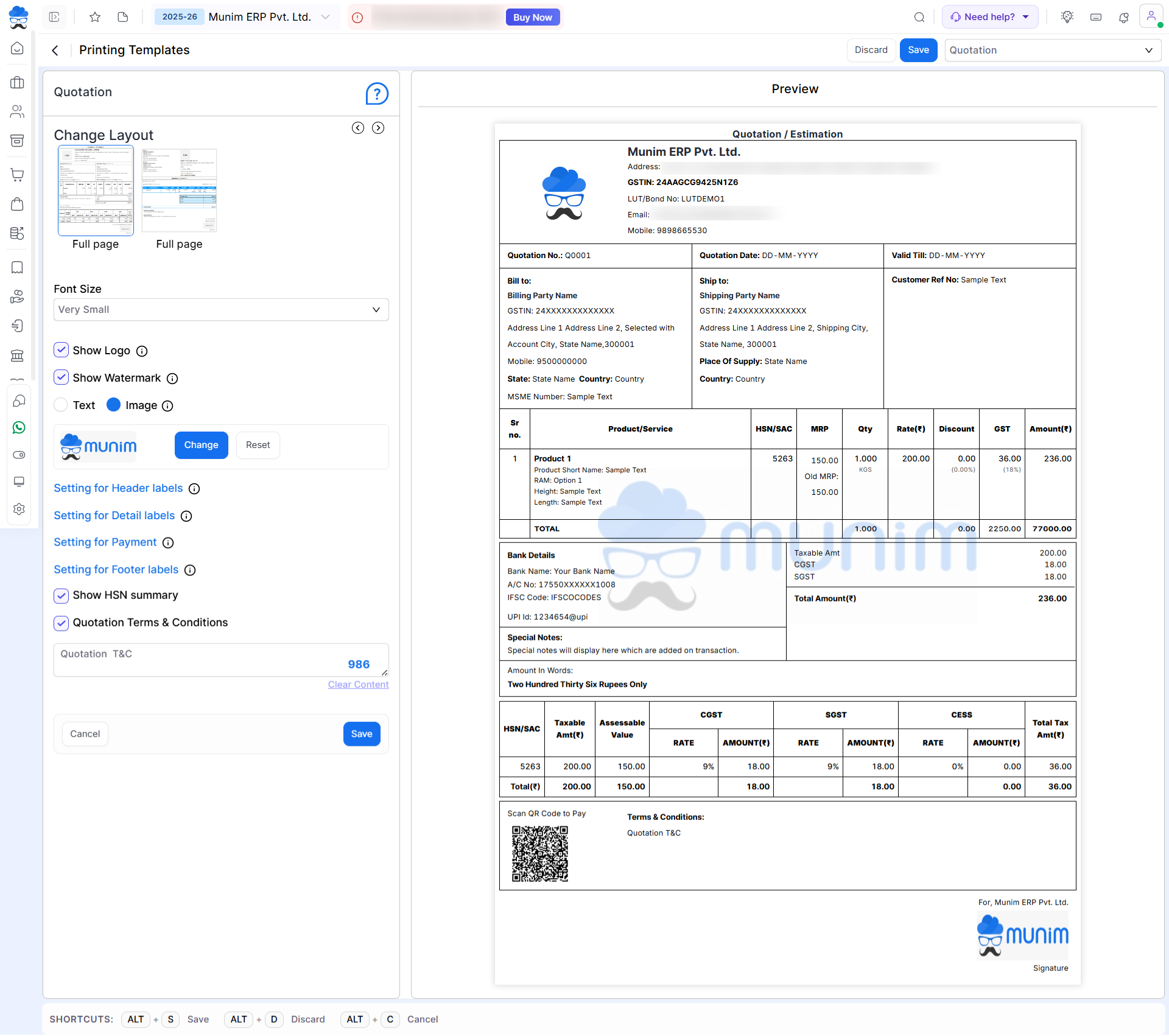 | Quotation Terms & Conditions | Here, you can include the Terms and Conditions within the print template. |