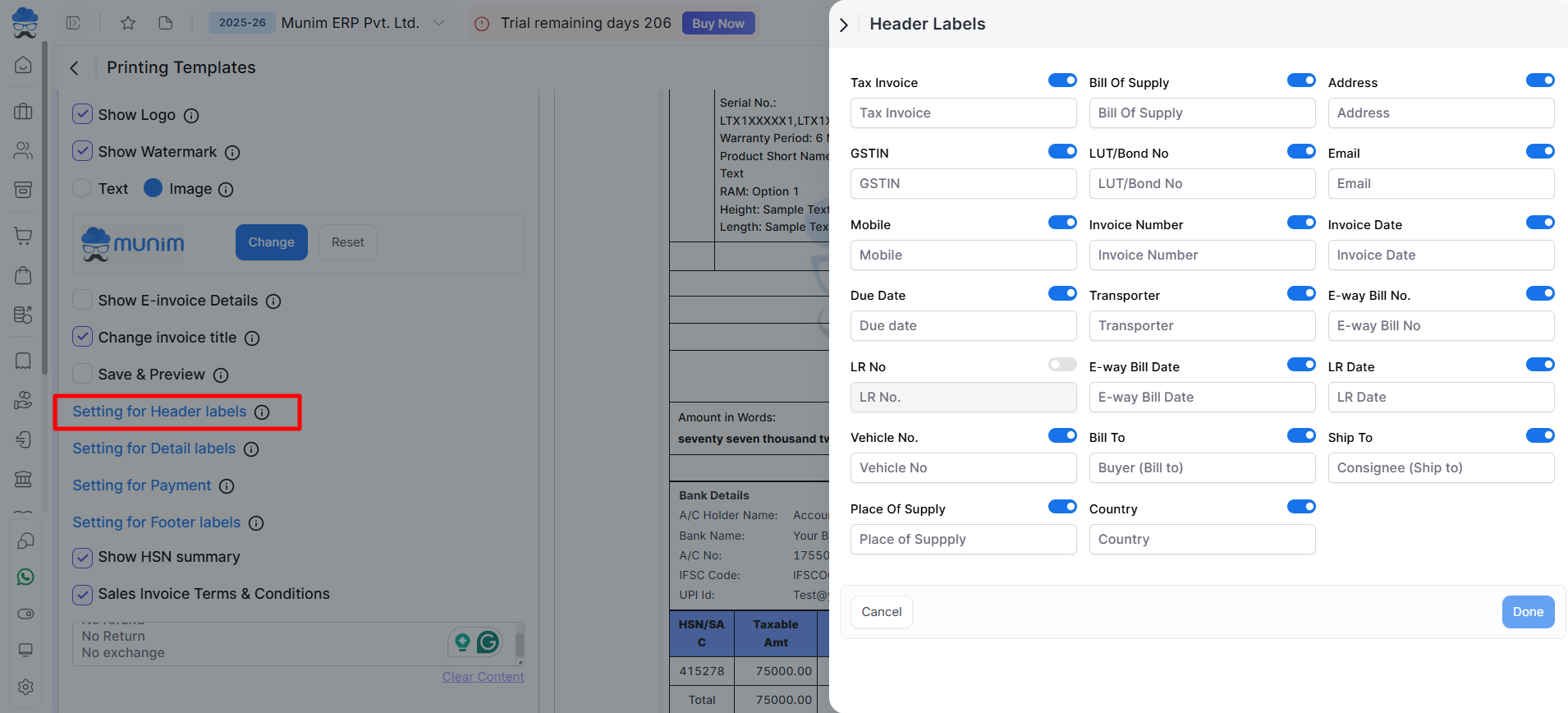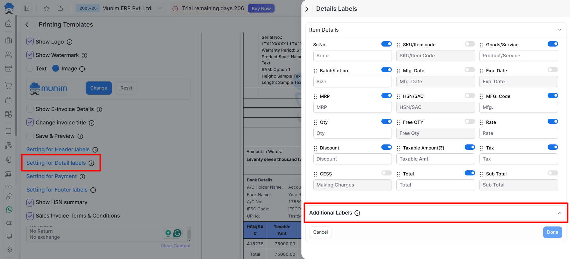- In the Additional Labels section, you can set up Description, Challan No., Serial No., Warranty Type, and Warranty Period.