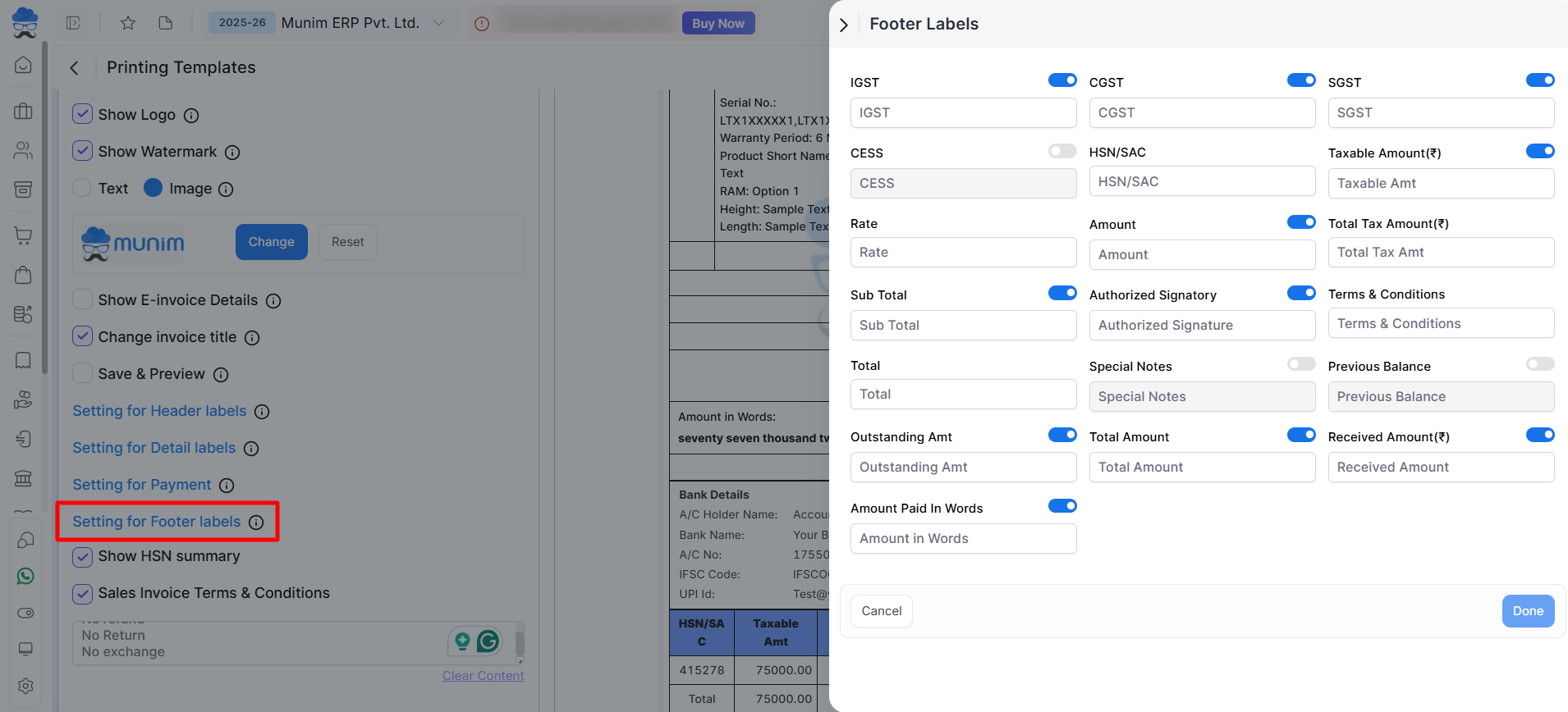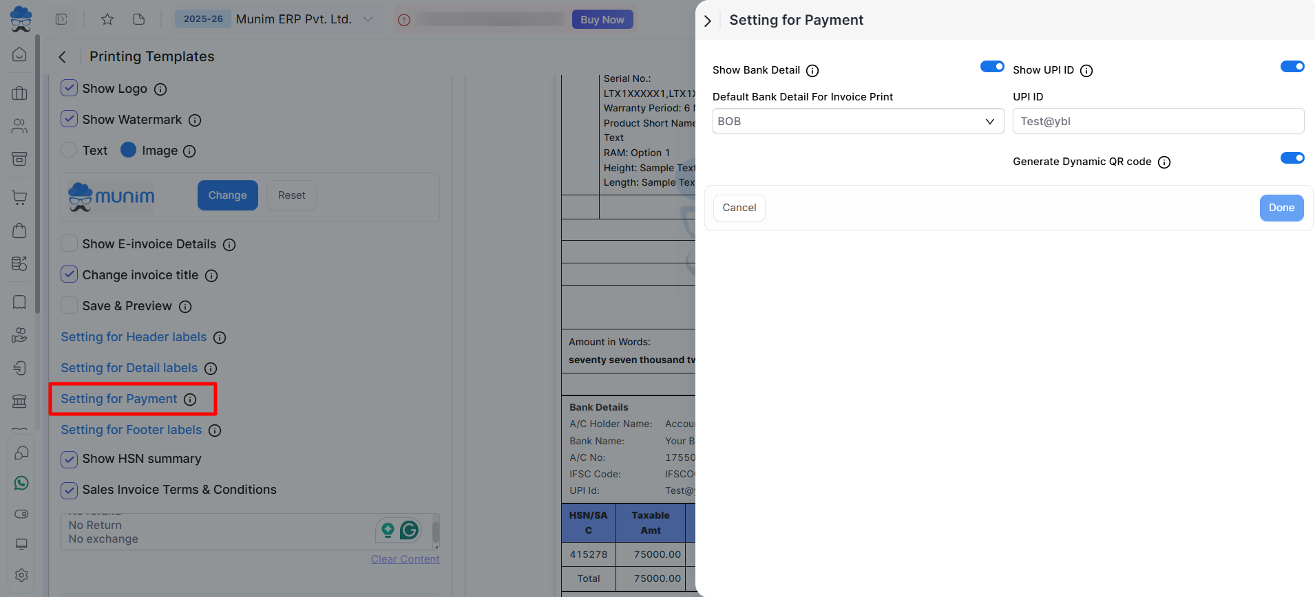 - This setting facilitates print customization to display payment-related details, such as bank information and UPI ID/QR codes.