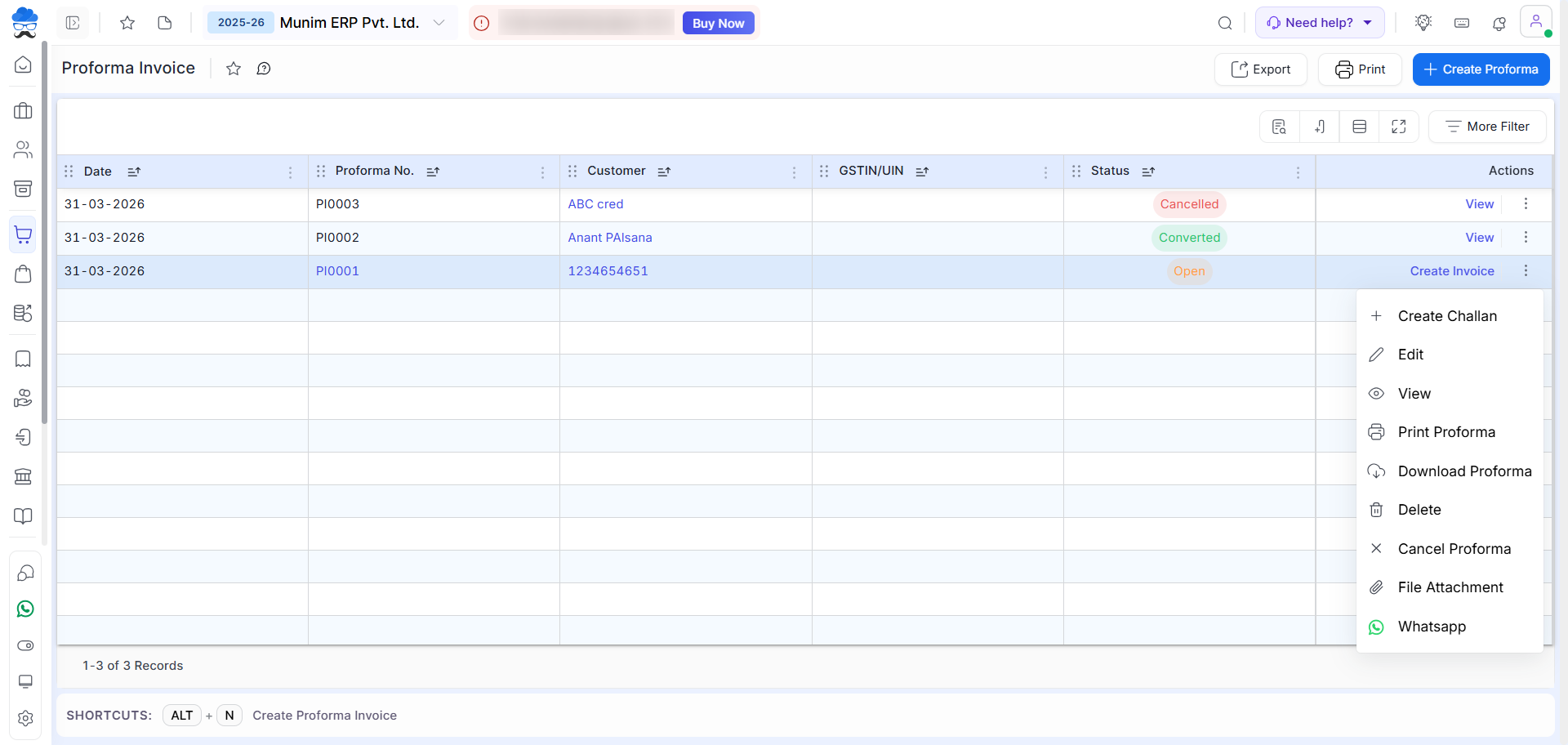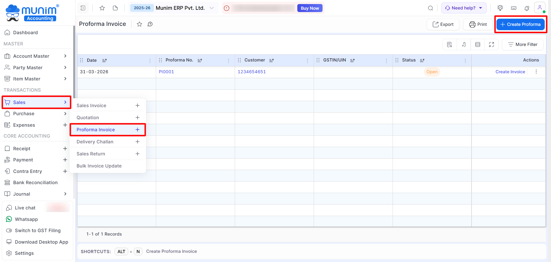 - On the list page, click on the “+ Create Proforma Invoice” button or press Alt + N
