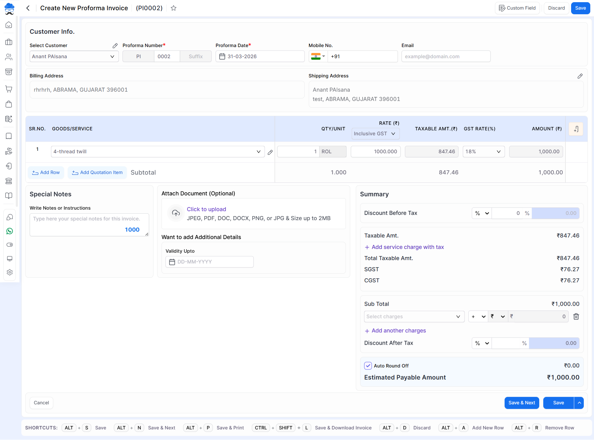 | Save & Print | Save and print Proforma Invoice | |