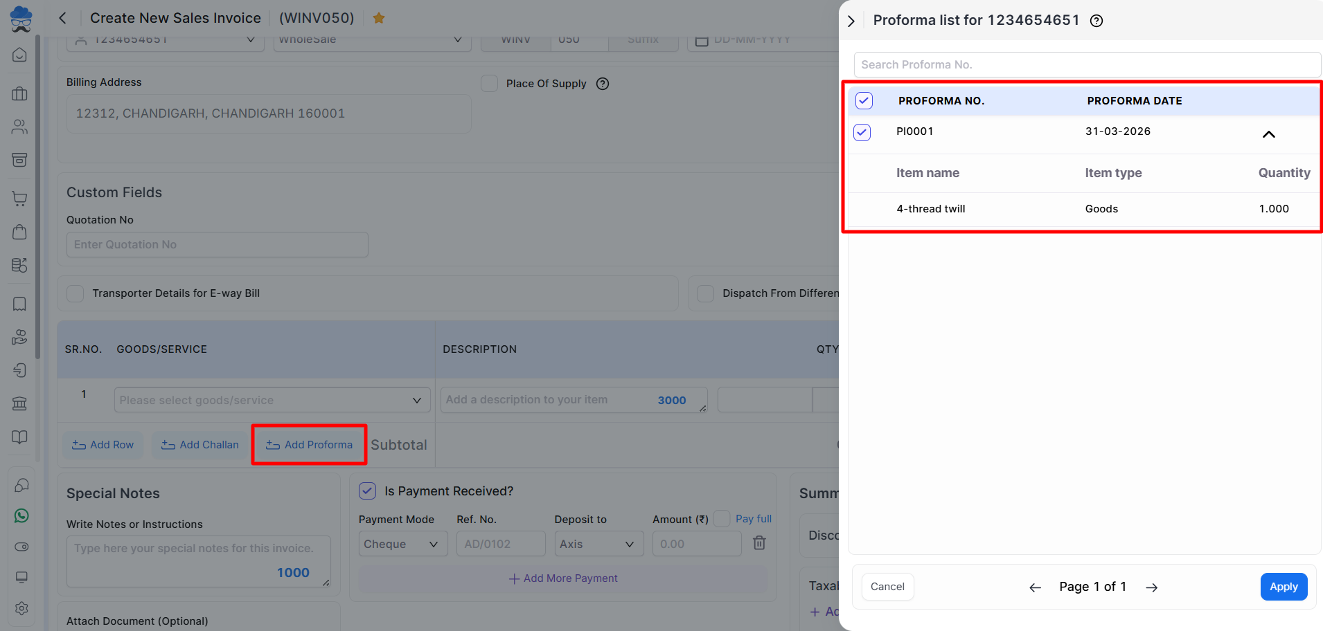 - You can create a Sales Invoice by adding multiple Proforma Invoices.