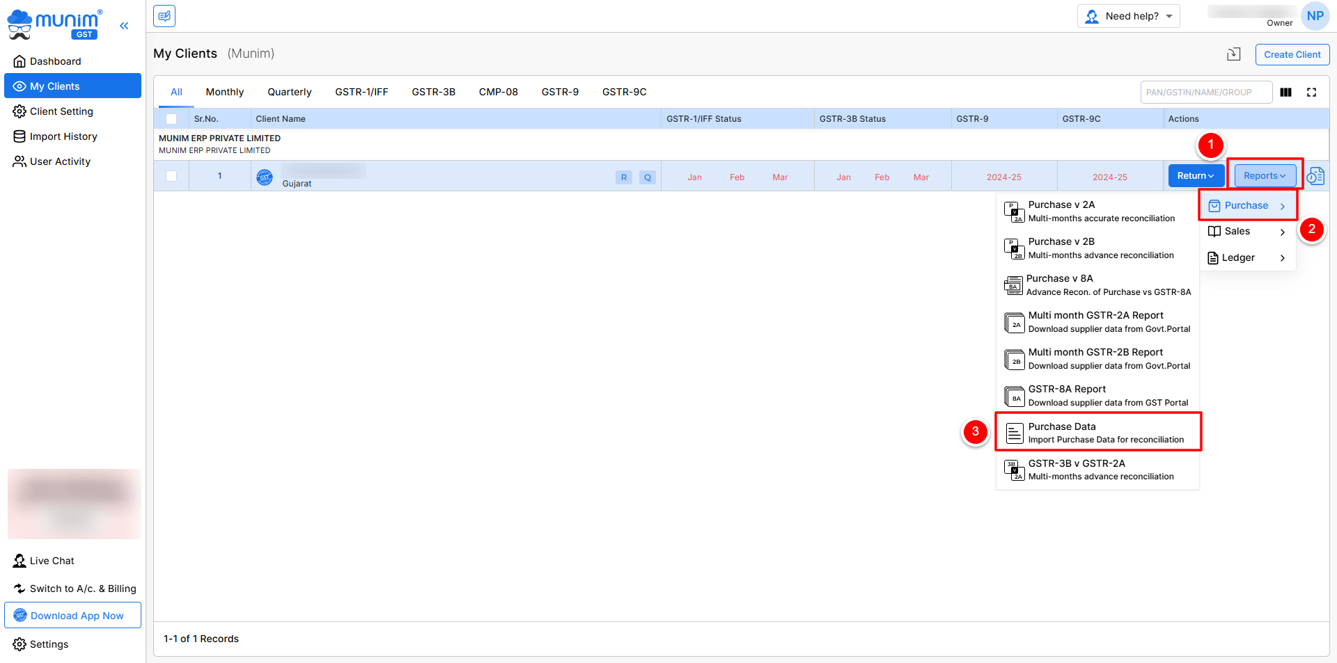 - On the My Clients page, click the Reports button, then click on the Purchase section and select “Purchase Data”.