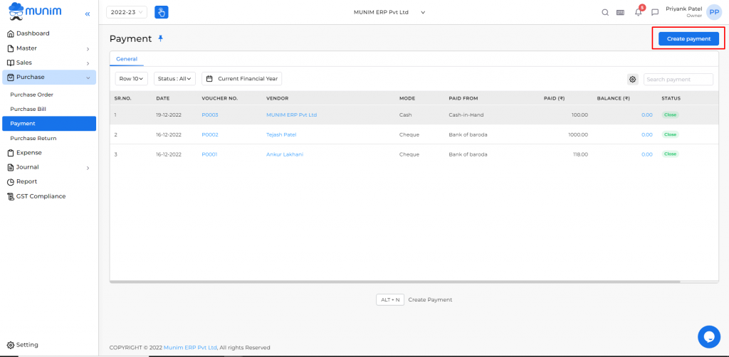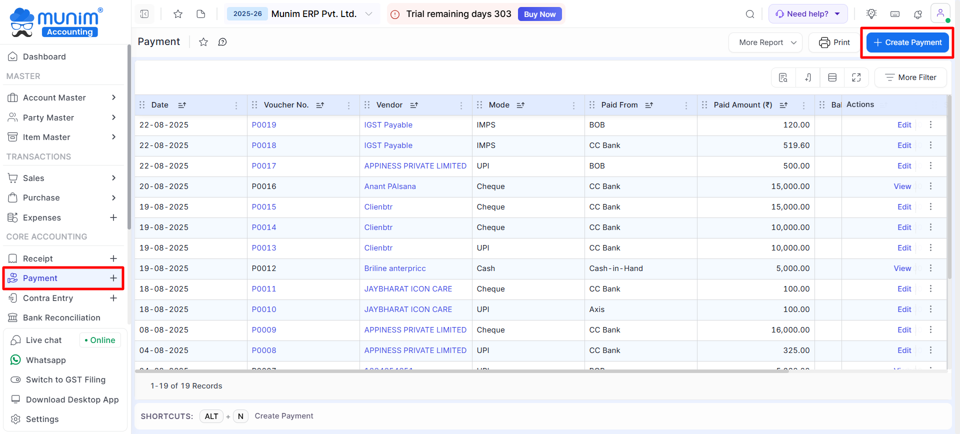 | Alt+N | Save & next- This shortcut is used to save the payment voucher and redirect on same page. |