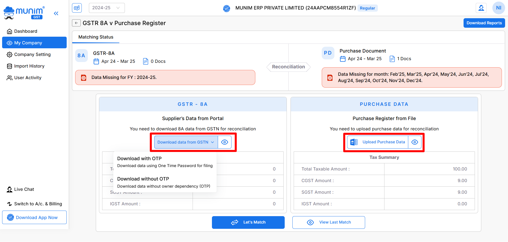 - Once both GSTR-8A and Purchase data are available, click on the Let’s Match button