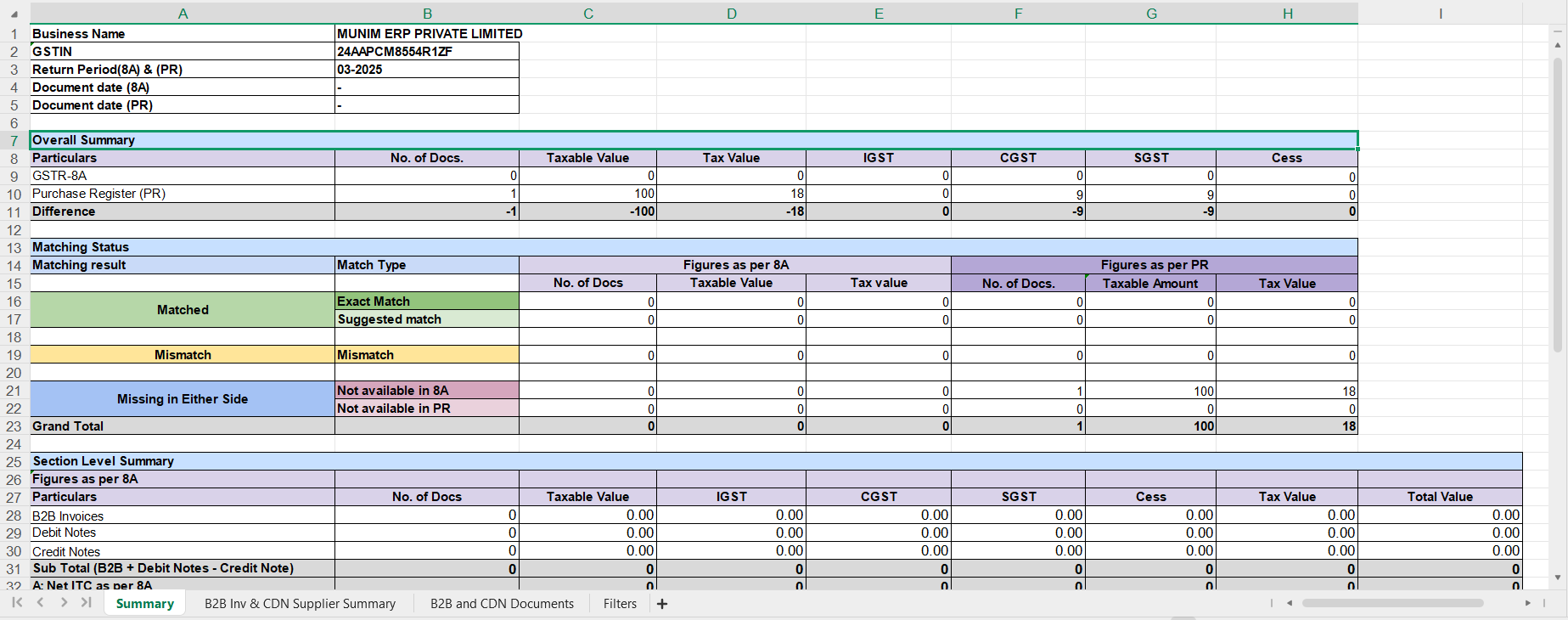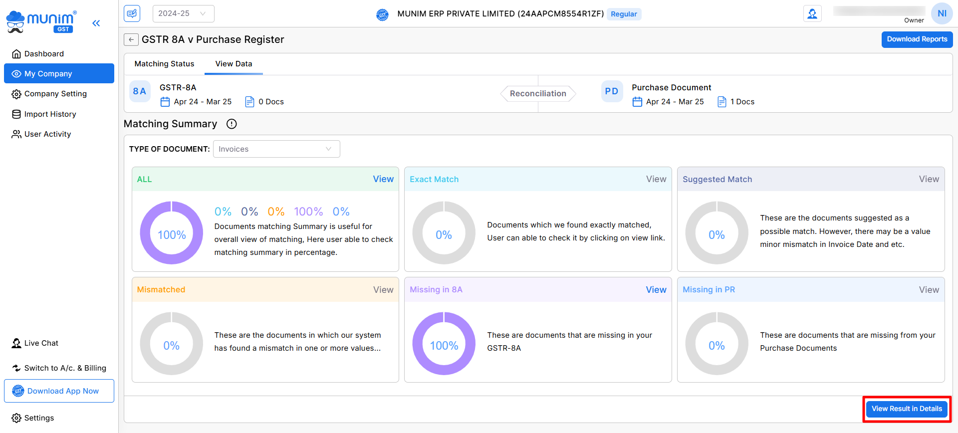 - All, Exact Match, Suggested Match, Mismatched, Missing in 8A, and Missing in Purchase Register