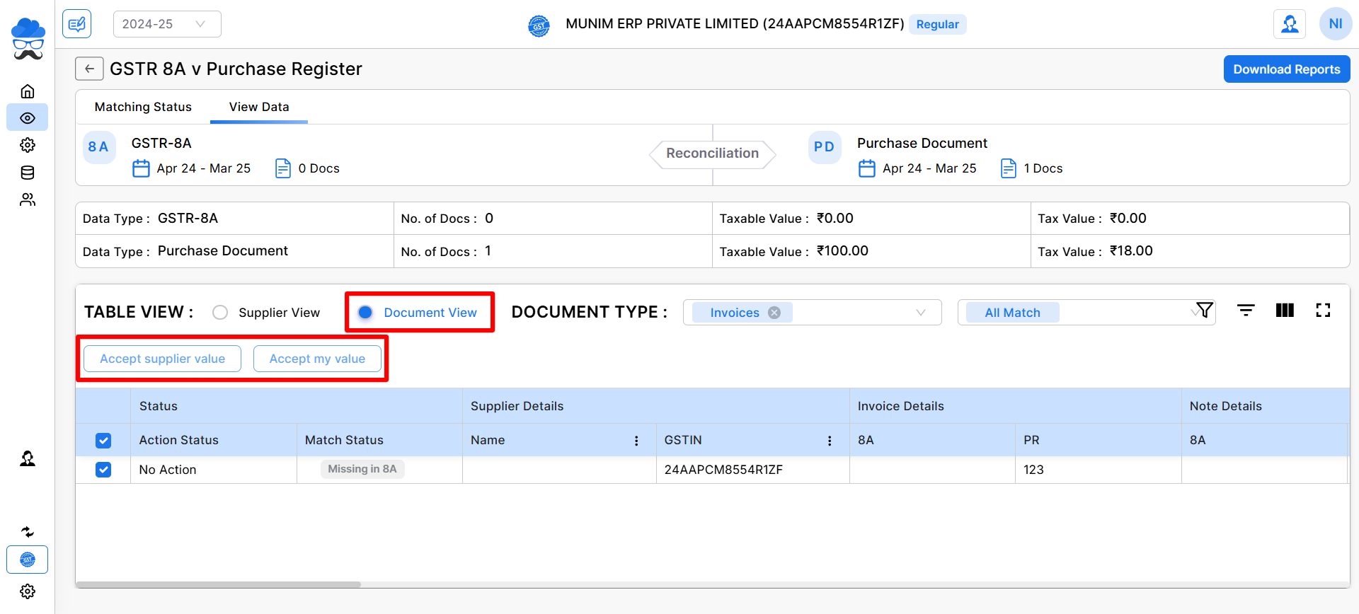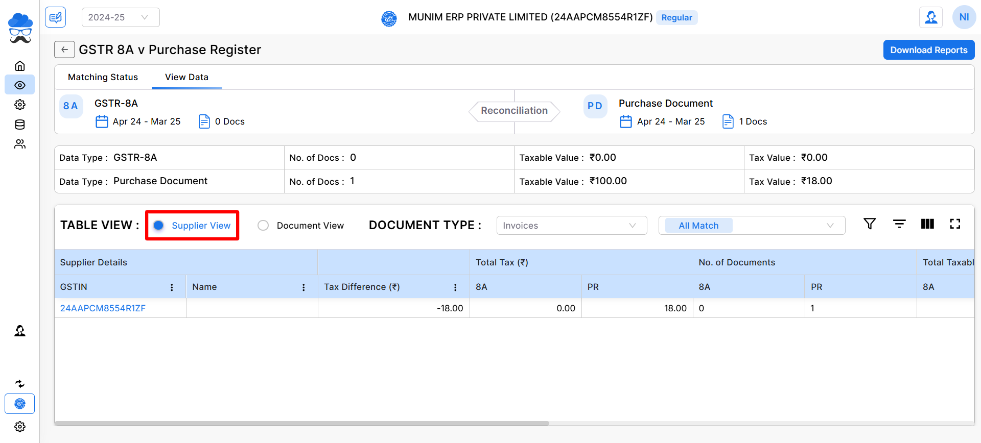 The Purchase vs GSTR-8A reconciliation process involves comparing the purchase data recorded in your books with the details available in GSTR-8A, a statement provided by the GST system.
