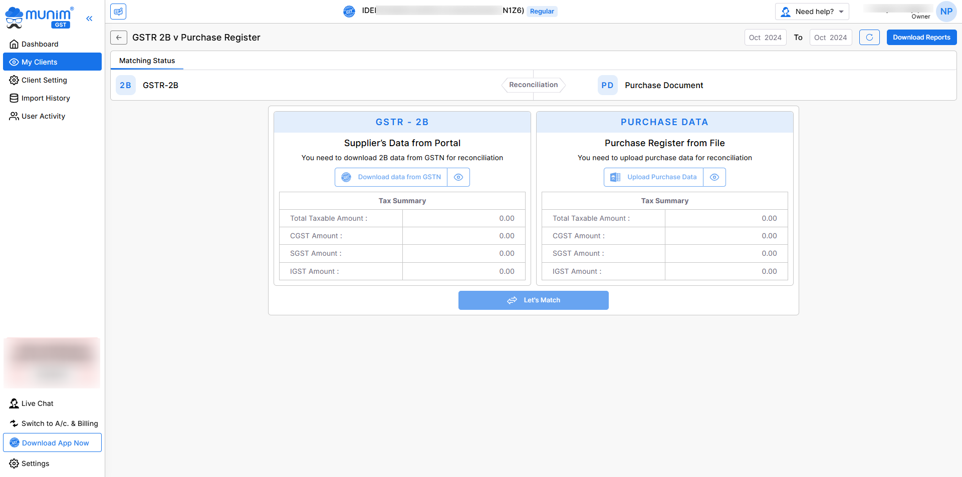 - On the reconciliation page, you will see two sections named GSTR-2B and Purchase Data.