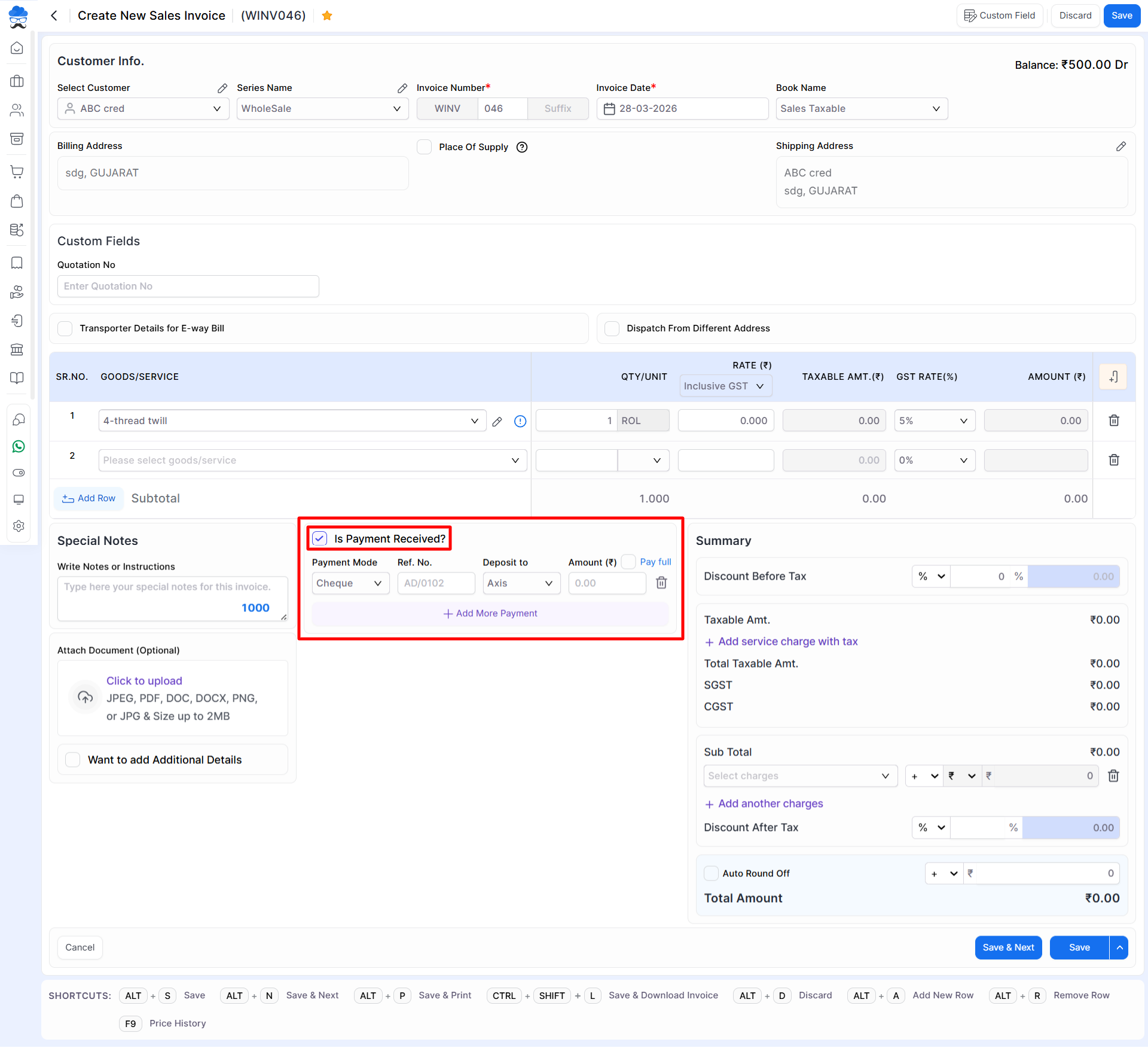 - Click on the “Is Payment Received?” checkbox button. Once clicking on it, It will show payment-related fields like Mode, Ref. No., Deposit to, and Amount.