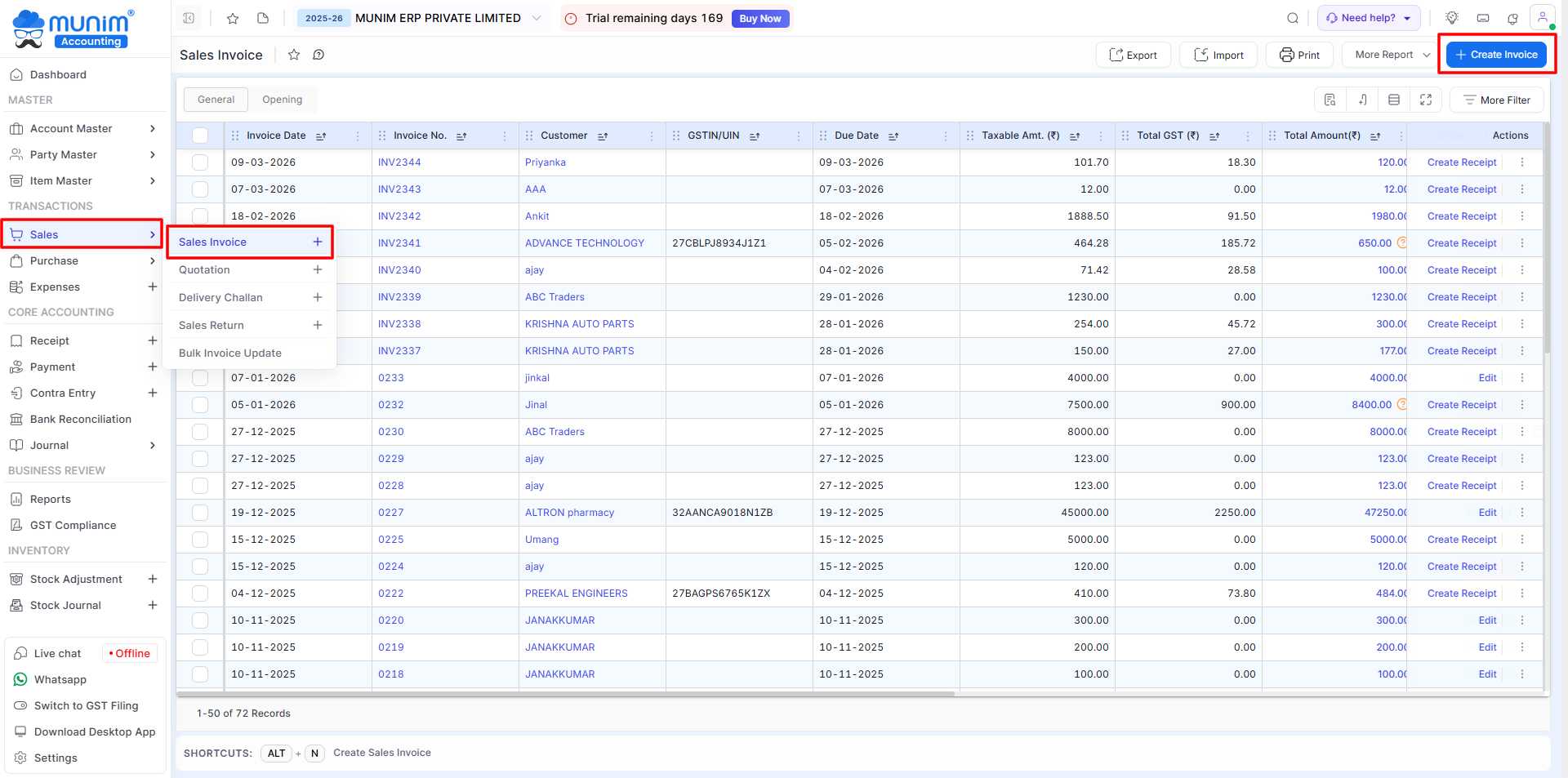 - Here, click on the Create Invoice button or press the Alt+N key.