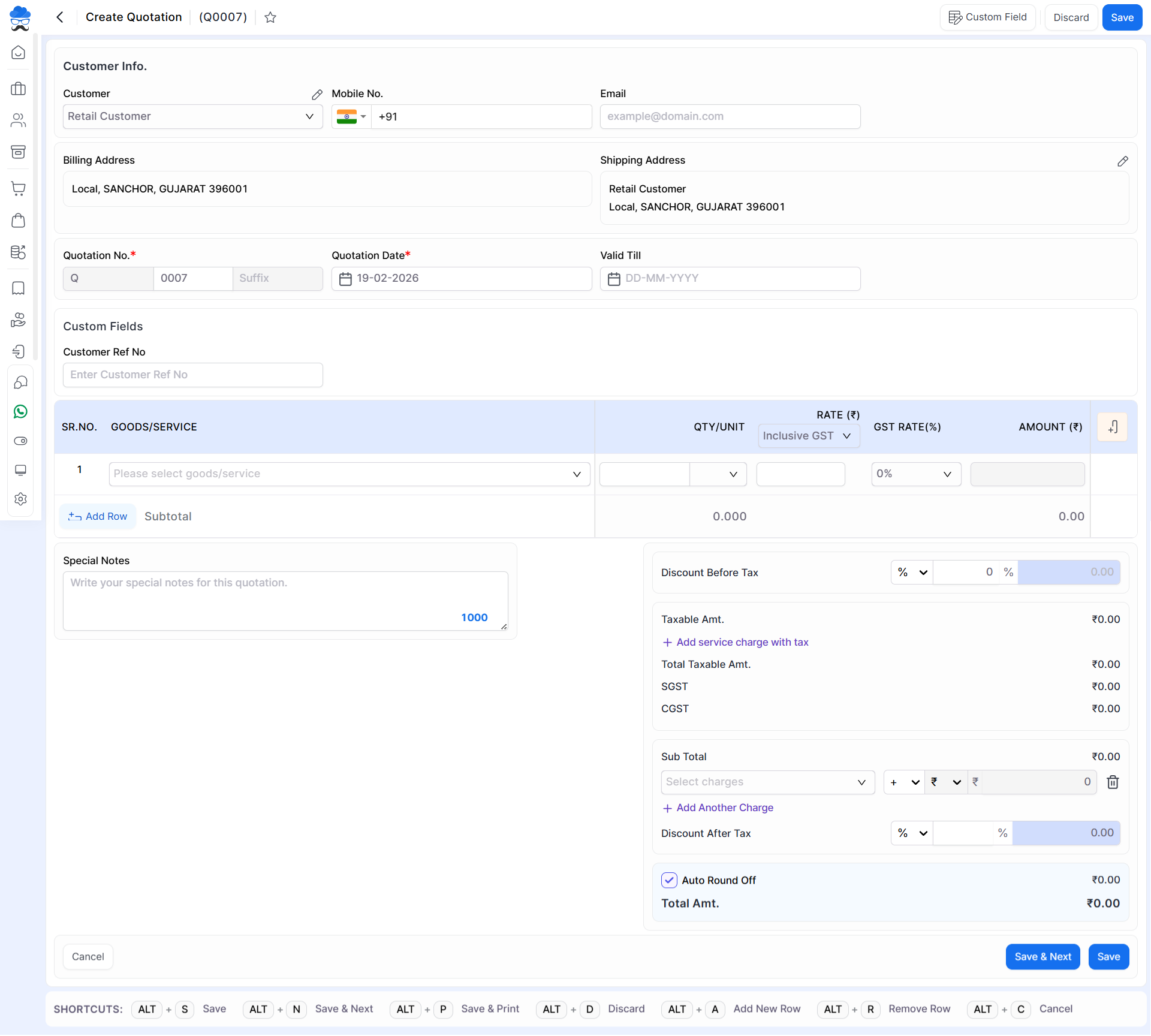 | Customer | Here select customers for creating quotations and can add new customers. | Mandatory field |