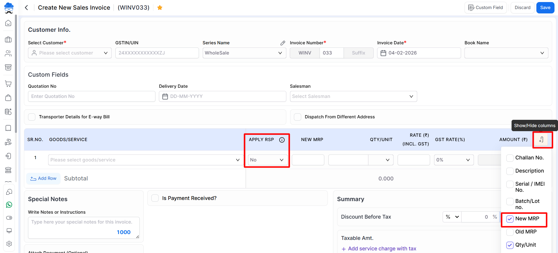 - The item grid includes an Apply RSP column if New MRP field is enabled.
