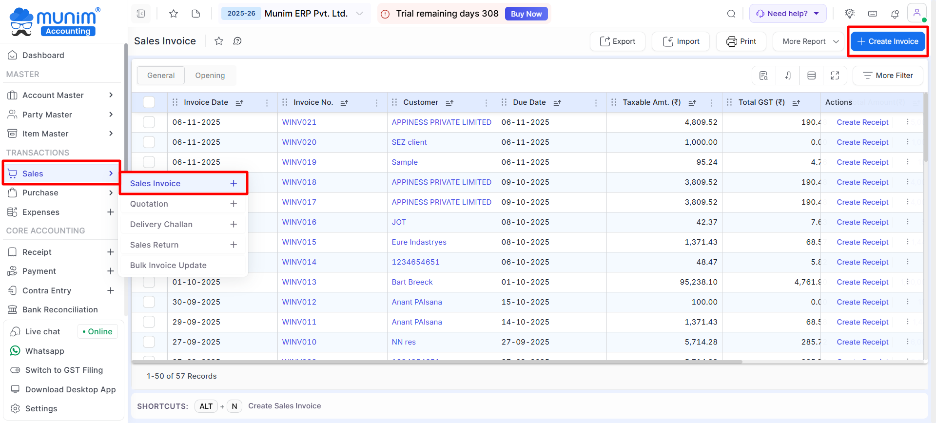 - On the Sales Invoice list page, Click on the + Create Invoice button or press the Alt+N key.