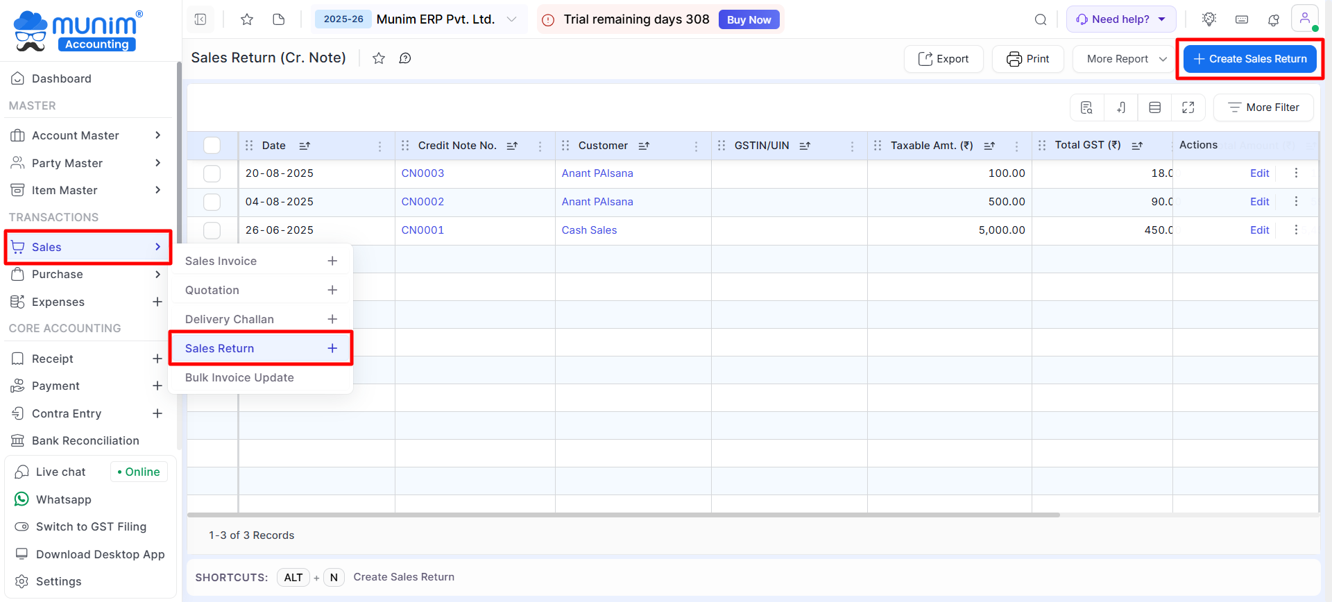 | Alt+D | Discard- This shortcut is used to discard the credit note. |