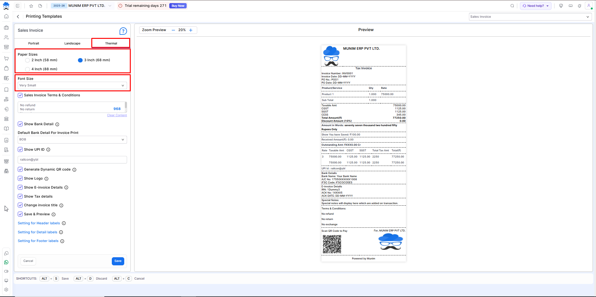 | Font Size | Here you can select the Size of print according to your Thermal printer size, from 2,3 and 4 inches. |