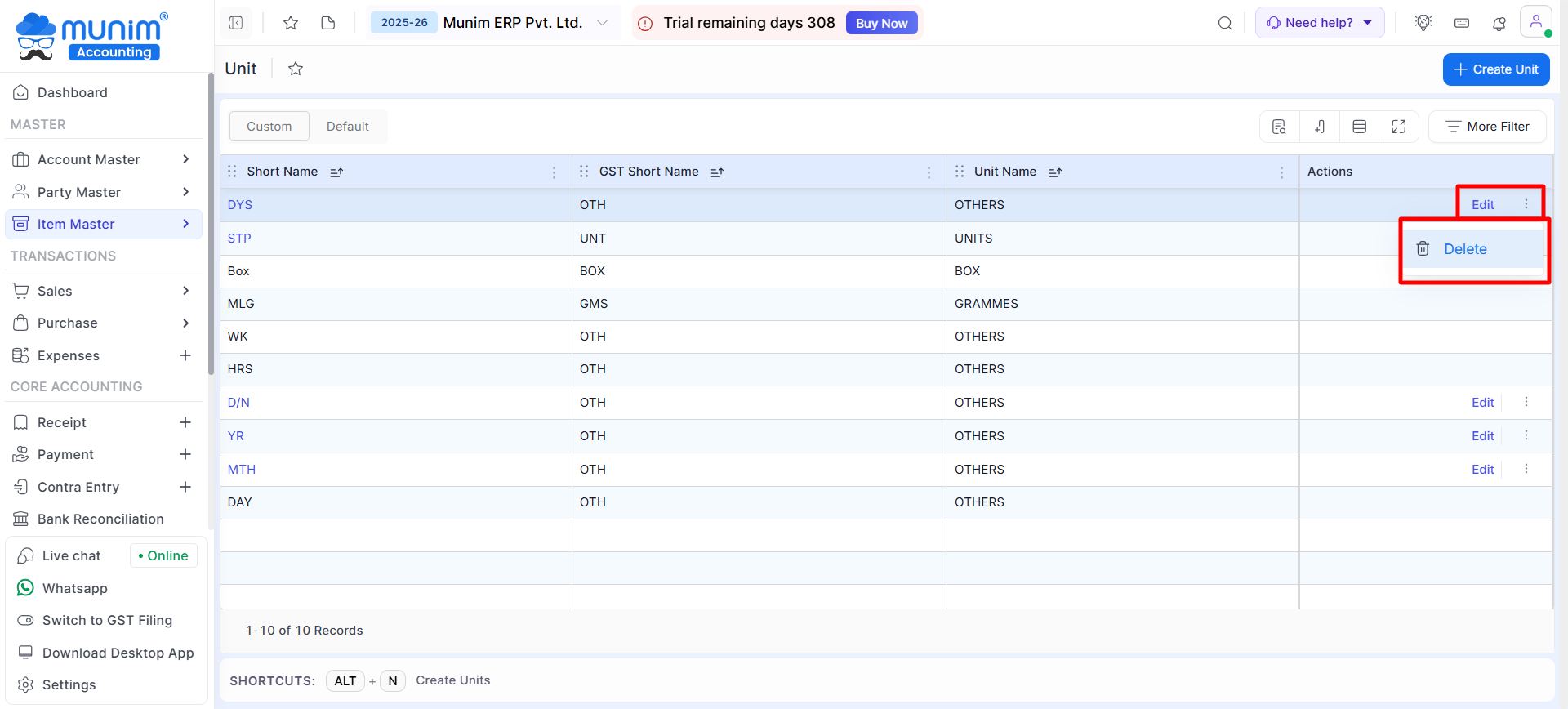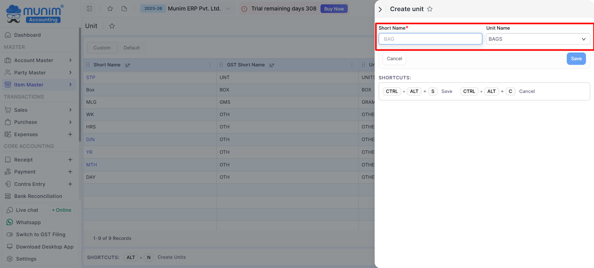 - The list of all existing units, along with their short names and GST short names, is displayed in a table format.