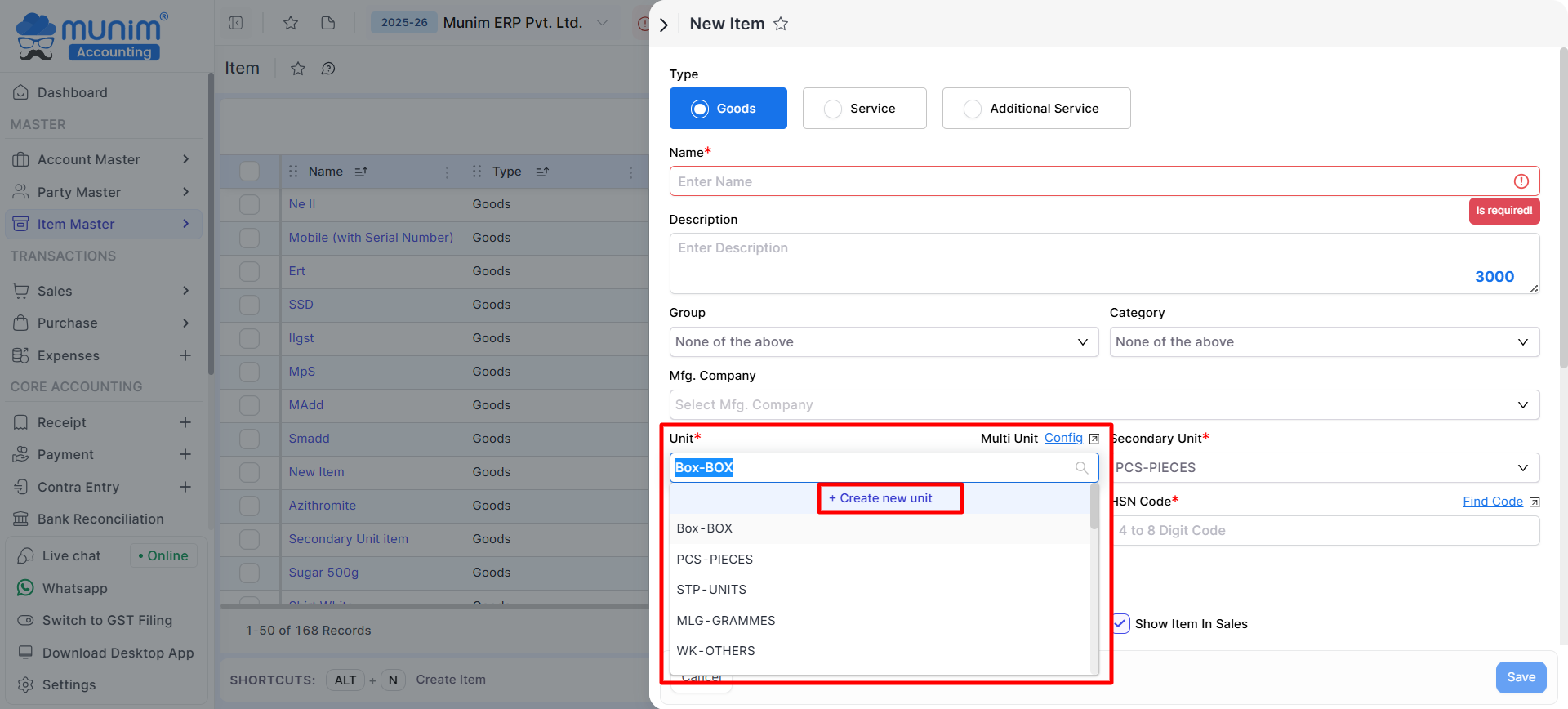 - All created Units will be displayed during the creation of a new item for selection, and you can also use the “Create new Item” option to create new Units.