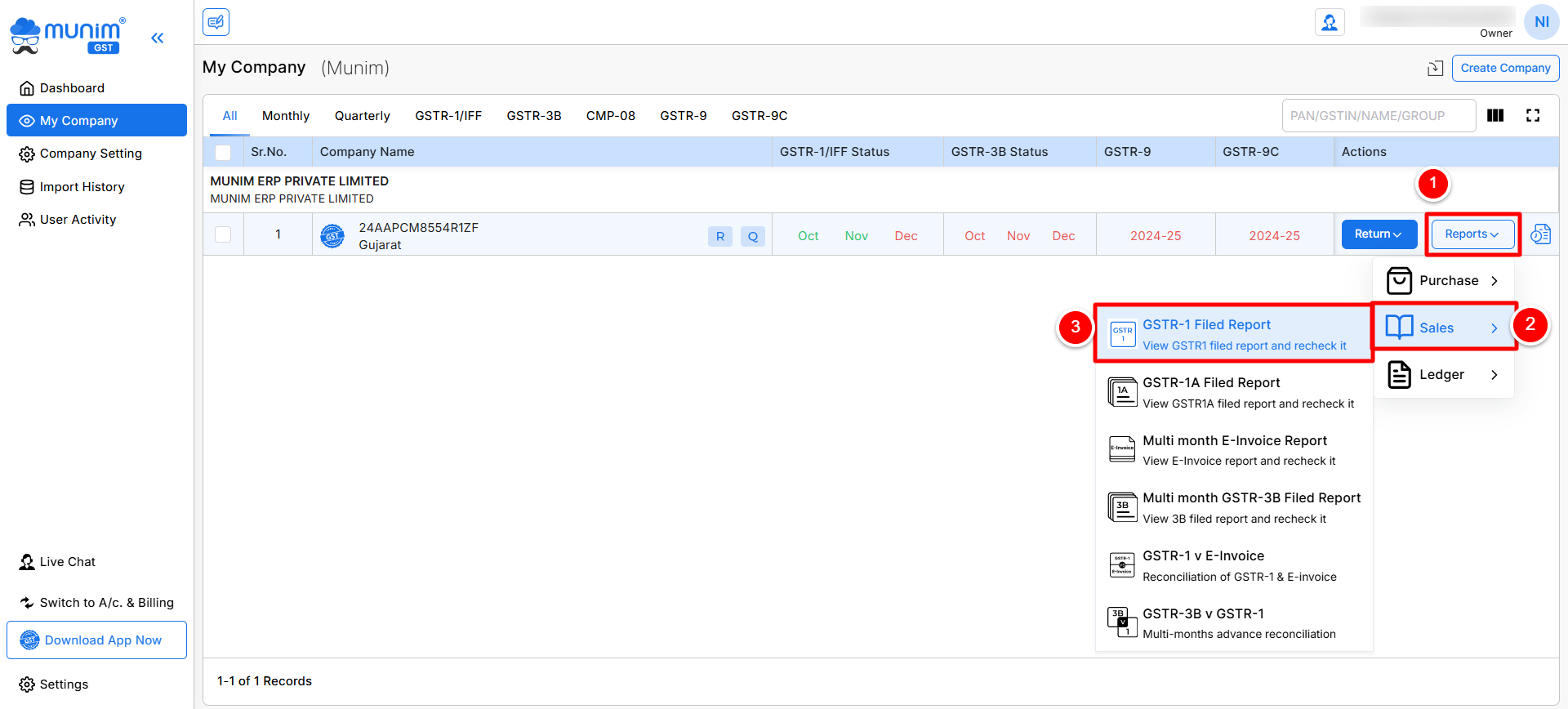 - Select Sales and then “GSTR-1 Filed Report” from the Reports on the My Company page.