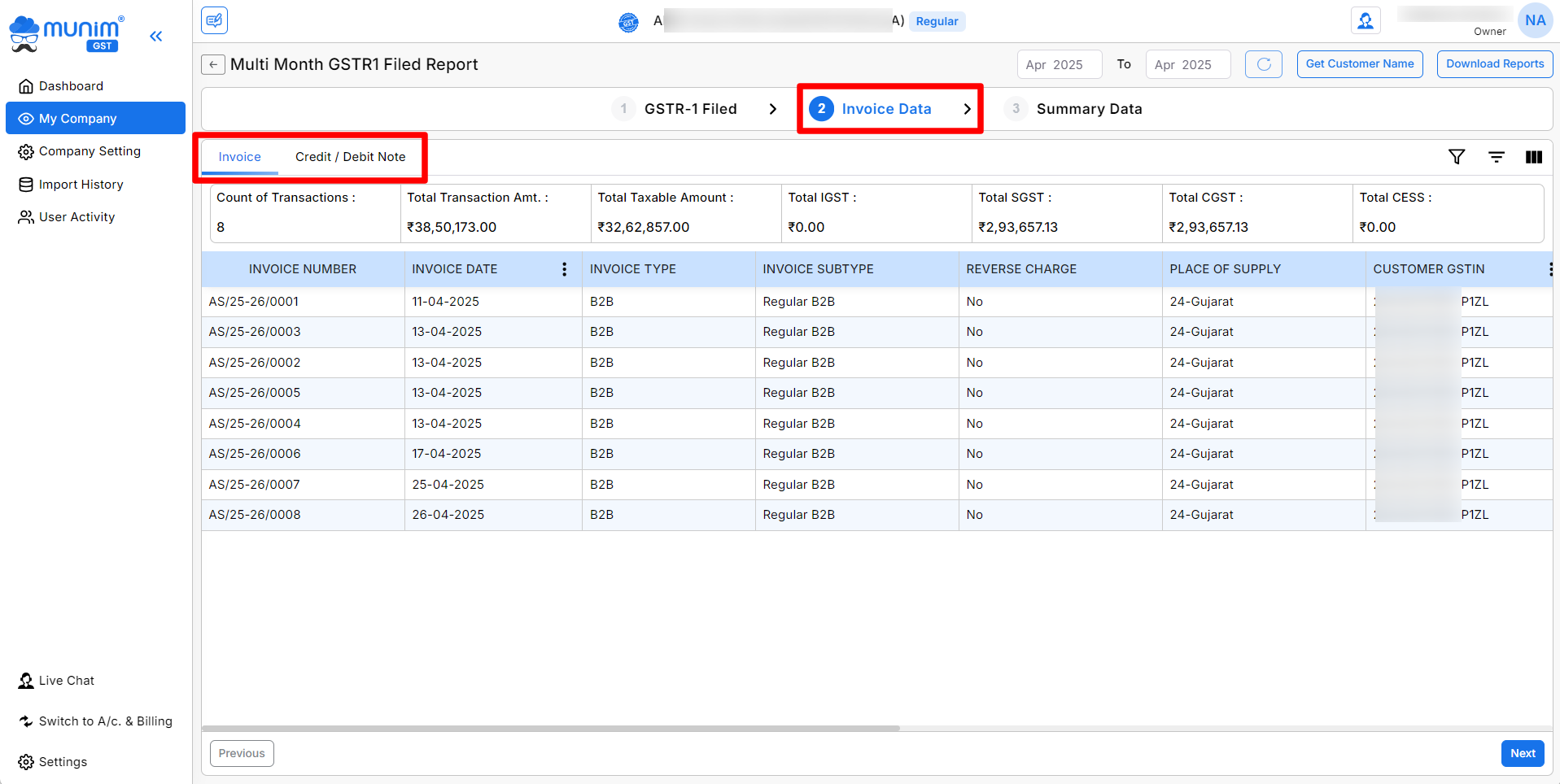 - Once the data is downloaded from the portal, on the Invoice Data page, you can check the data that is available in Invoice format. eg, B2B, Credit/Debit Note