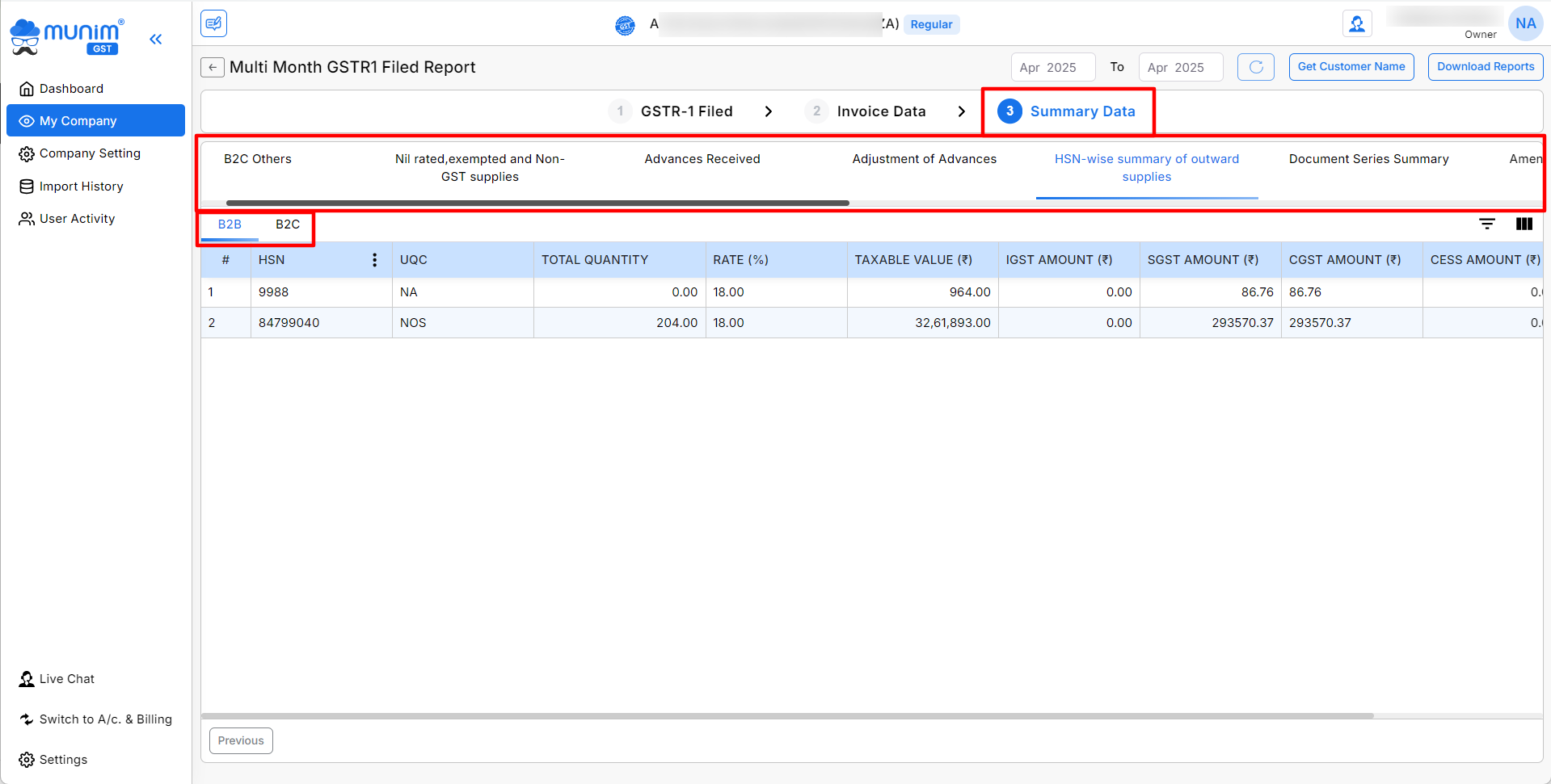 - Also, you can view the summary-level data on the summary Data page screen for the selected month. eg, B2C, HSN summary