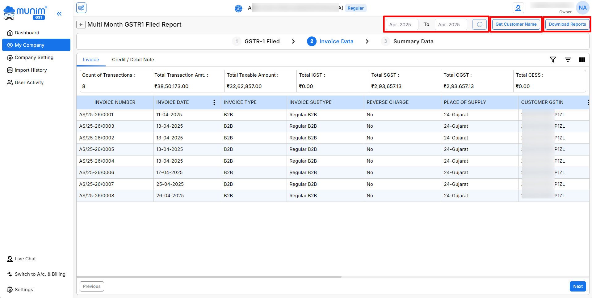 - A feature is available to retrieve Customer Names if they are absent from the data list; this can be accessed via the Get Customer Name button located in the top right corner.