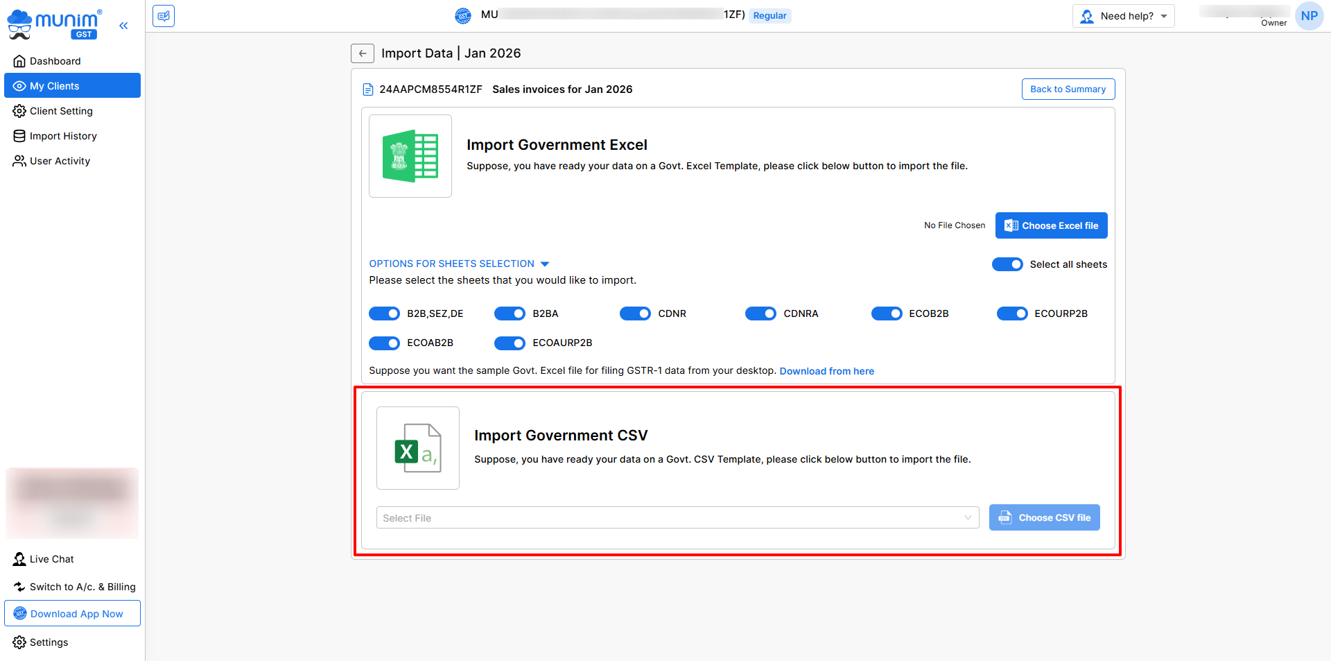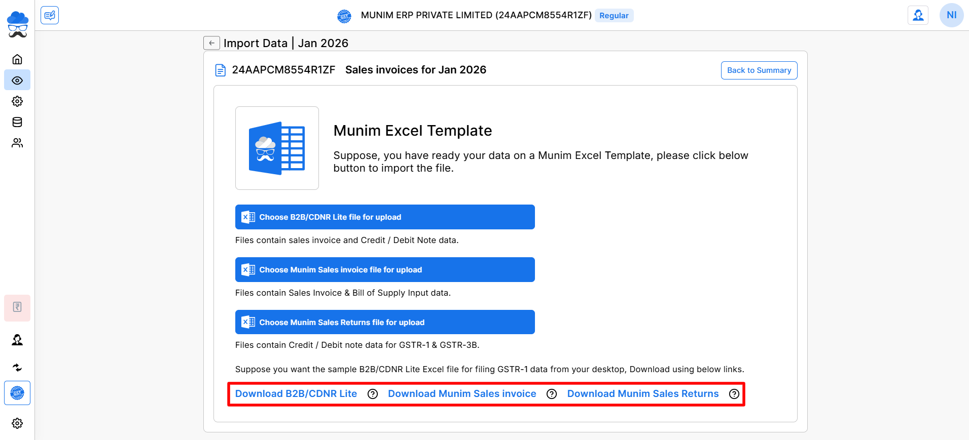 Within Munim GST filing software, we provide a range of methods and file formats to facilitate data uploads.