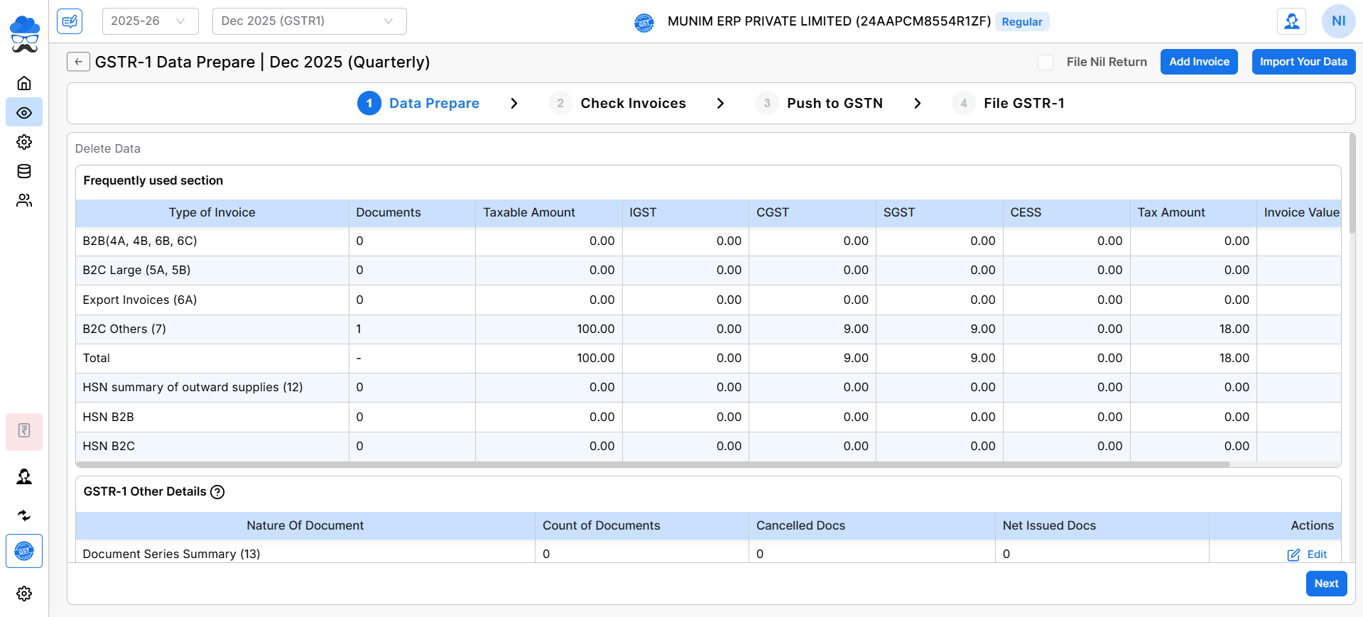 - Munim Sales Invoice: Here, you can prepare a file with Invoices with all data like B2B, B2C, B2CL, HSN, Amendment and Export.