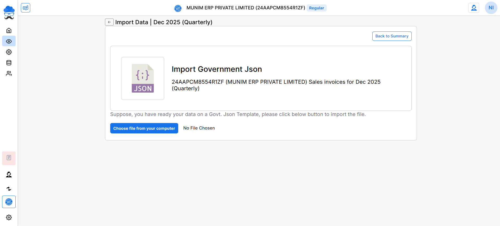 - On the GSTR-1 import data page, choose the JSON File option and click on it. You’ll see a “Choose file from your computer” button.