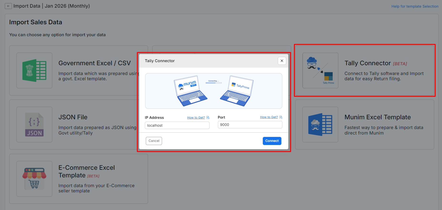 - The Tally Connector feature in Munim GST allows you to directly import your Sales and Purchase data from Tally Prime into Munim GST for Reconciliations and filing your GST returns.