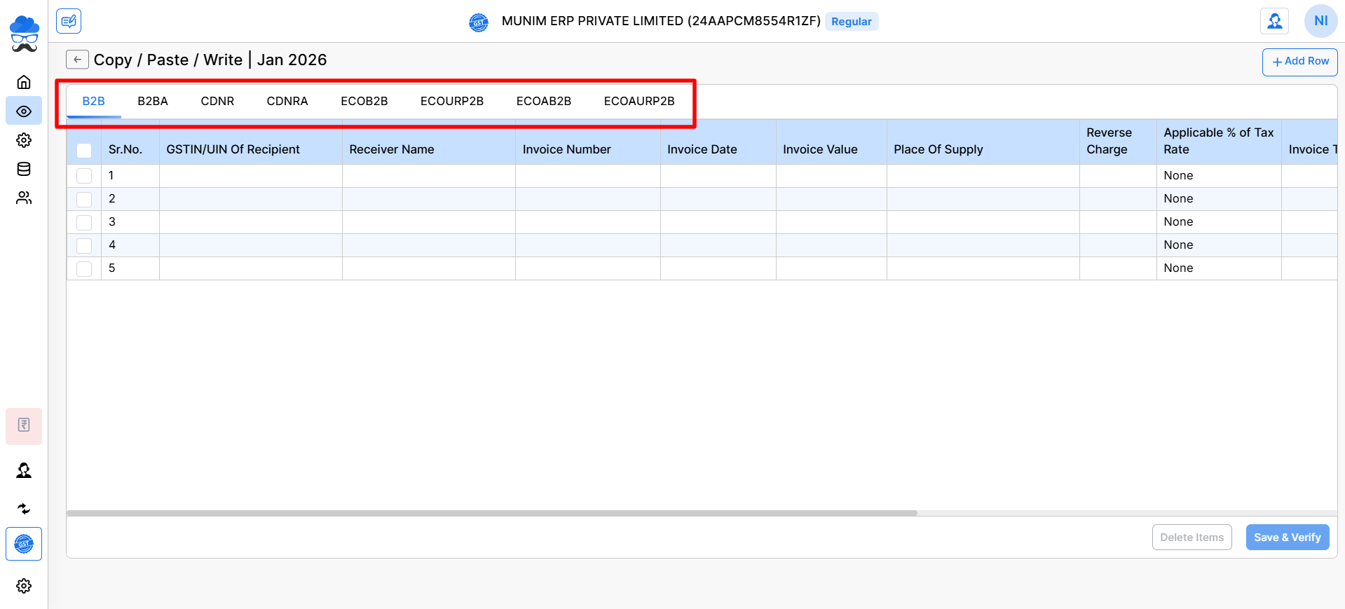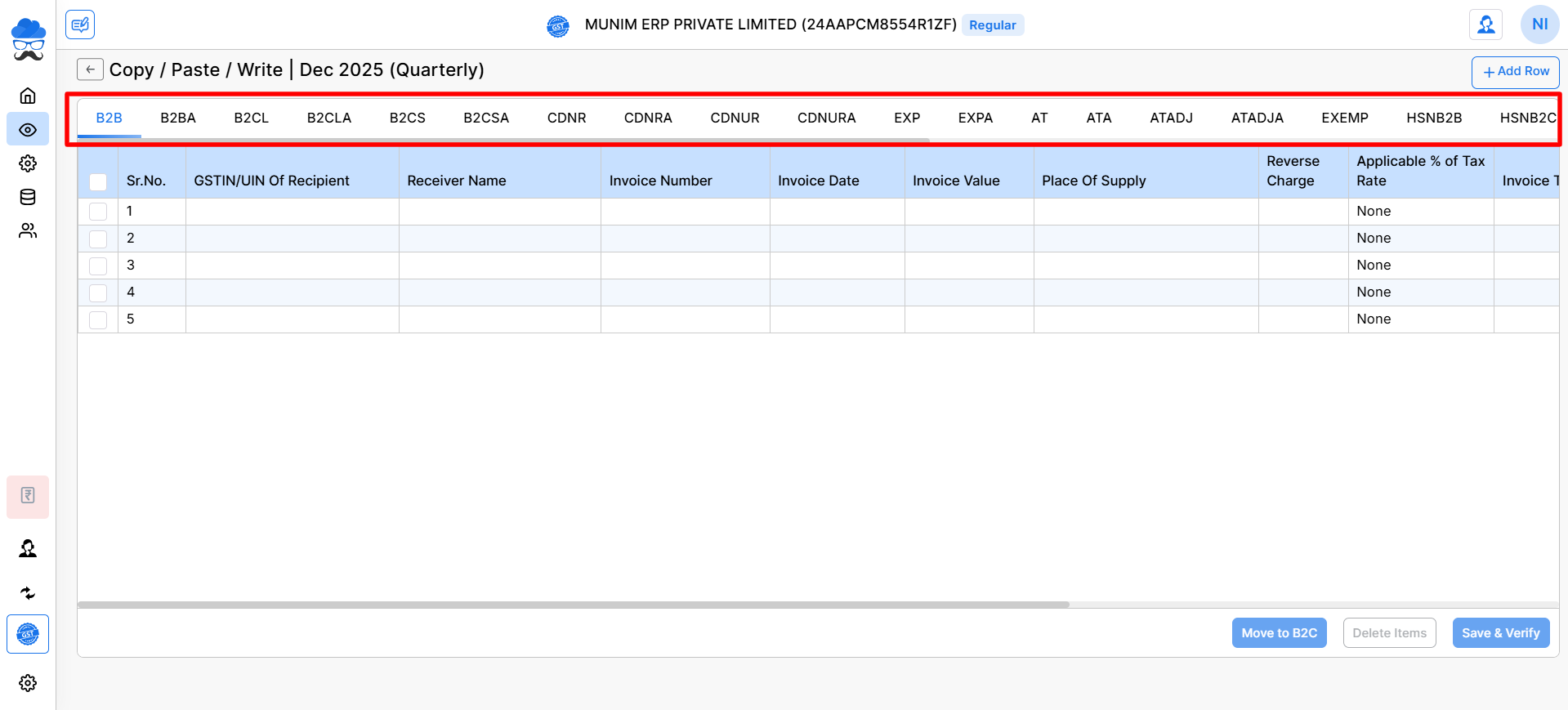 - Munim Sales Invoice: Here, you can prepare a file with Invoices with all data like B2B, B2C, B2CL, HSN, Amendment and Export.