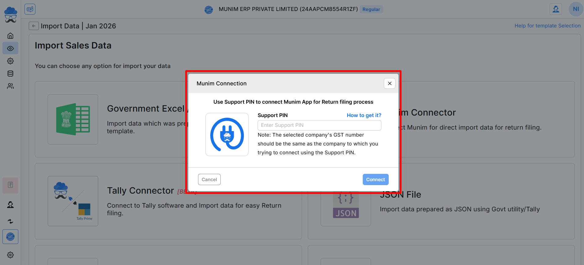 - The Tally Connector feature in Munim GST allows you to directly import your Sales and Purchase data from Tally Prime into Munim GST for Reconciliations and filing your GST returns.