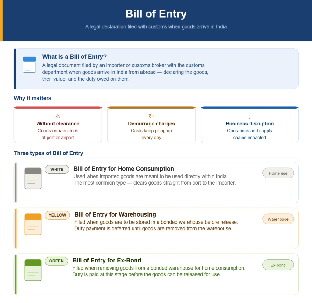 A Bill of Entry is a legal document that an importer or their customs broker files with the customs department when goods arrive in India from another country. It is basically a declaration that says, "These goods have arrived; here is what they are, here is their value, and here is the duty we owe on them."